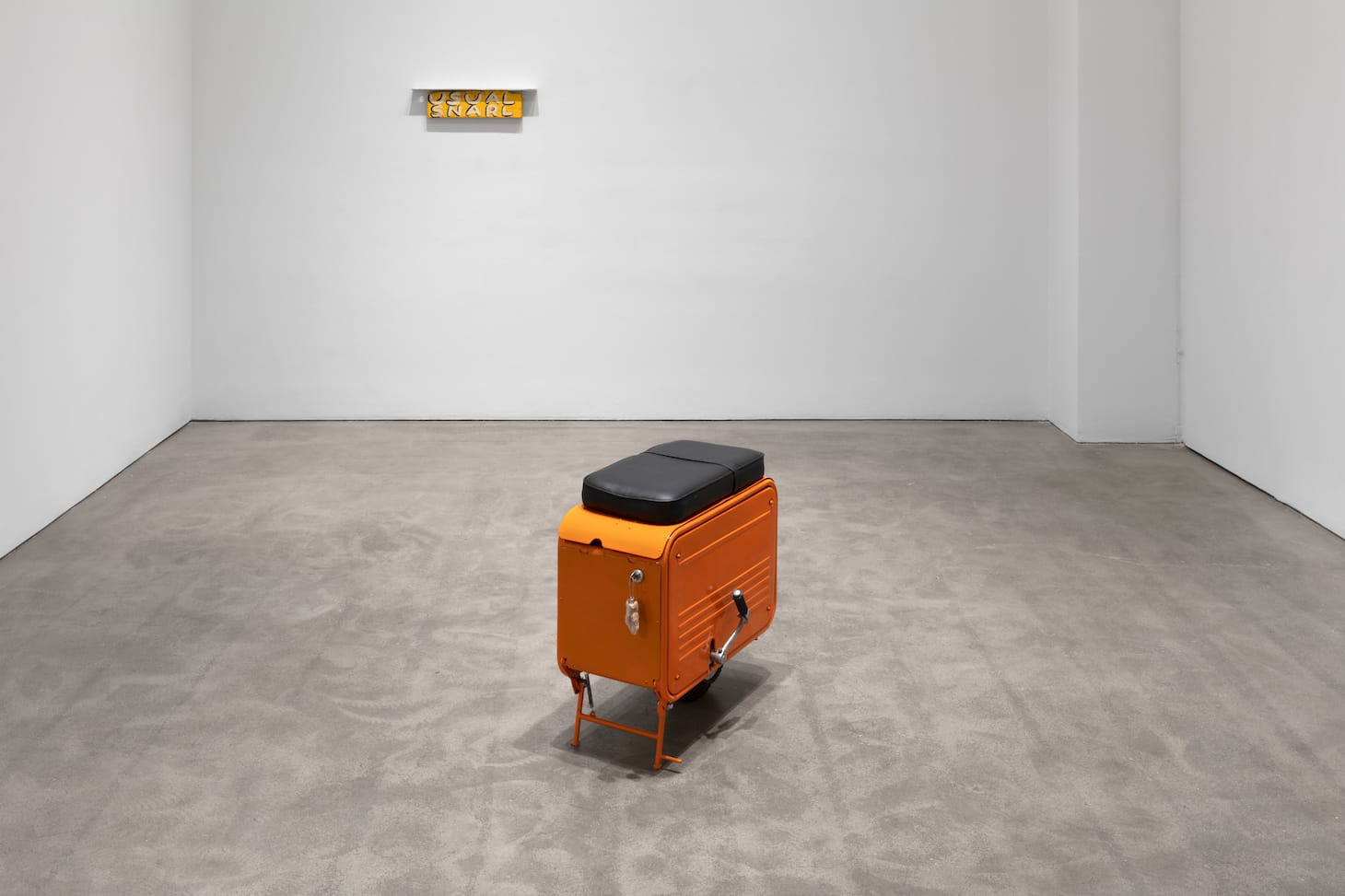 Grosvenor’s “Untitled” (2020) is an orange Valmobile scooter from 1961, the last year it was produced in Japan by the Hirano Motorcycle Company (production began in 1956). Known as the “suitcase scooter,” the handlebars, crossmember, and front wheel were stored beneath the seat. “Untitled” is the metal suitcase resting on its back wheel and front stand, with everything you need to drive it off presumably beneath the seat. The ignition key, attached to a rabbit’s foot, is visible in the front.