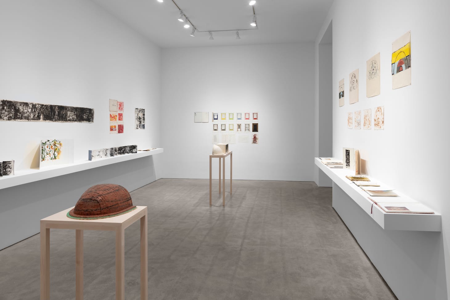 In addition to the five-panel painting, “Untitled,” Novros is represented by two sculptures, watercolors, inks on paper, disassembled notebooks with unframed sheets of paper affixed to the wall, and notebooks on shelves, amounting to a plenitude of work dated between 1978 and 2019.