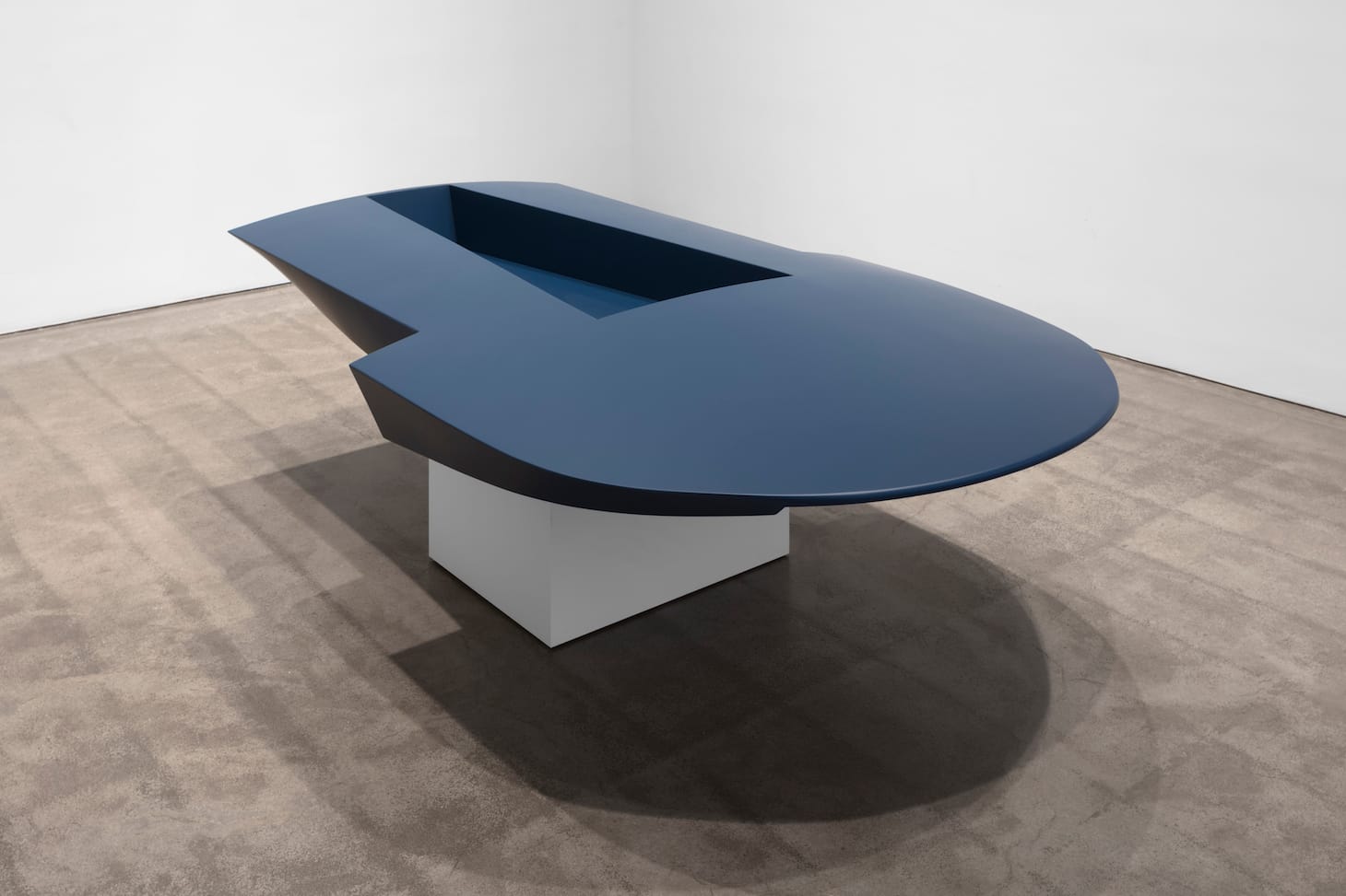 In addition, Grosvenor seems deeply interested in design challenges. One gallery contains the immaculate hull of a racing boat made of blue lacquered aluminum resting on a pedestal. “Untitled” (2019) has a semicircular front with a long, trapezoidal cavity extending from the narrower back. Stripped down to shape, color, and flawlessly smooth surface, it is a marvel of aerodynamic design.