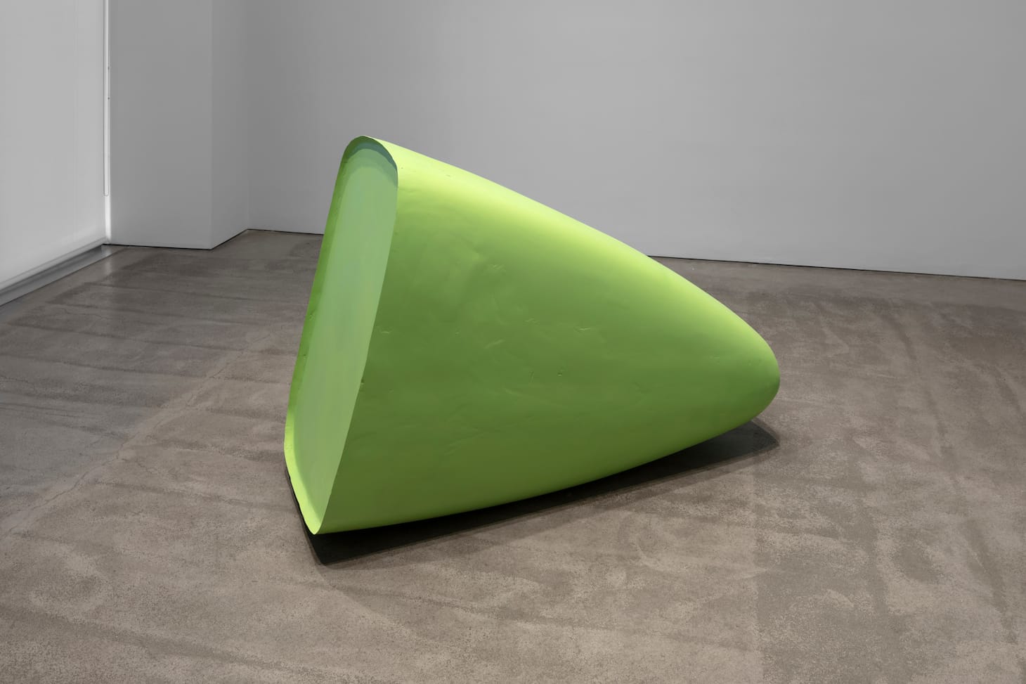 In the gallery directly opposite, a light green, nosecone-like shape lies on the floor, as if it has just keeled over, inexplicably. Made of spray-painted sheet metal, “Untitled” (2019) feels engagingly, tenderly, and amusingly awkward, particularly in comparison to the racing-boat sculpture. The use of auto body filler to seal the bottom sheet to its housing add a human touch to the work.