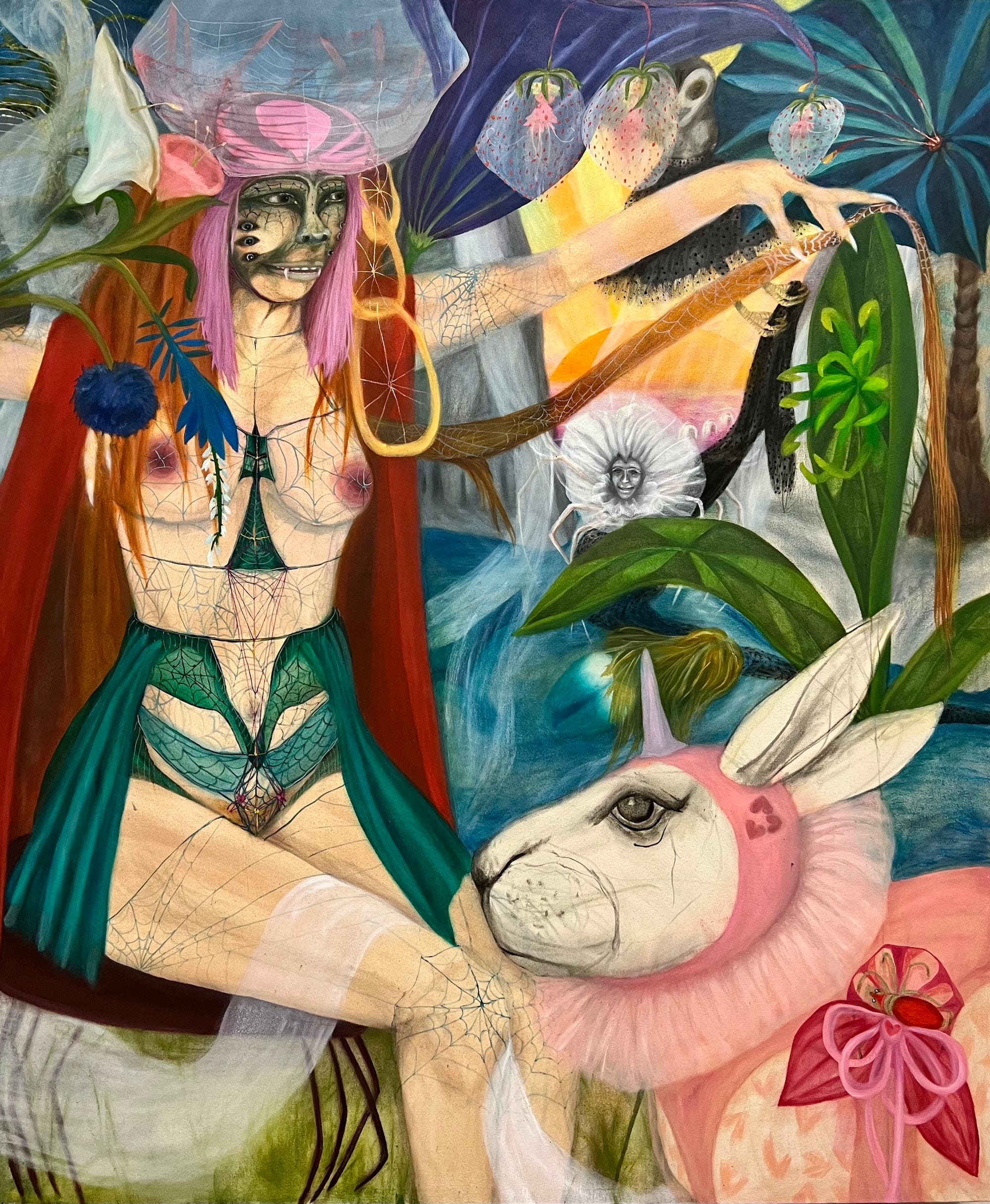 While not explicitly sexual, Pfeffer’s paintings are certainly erotic, with their sensuality presented in a mostly theatrical way. In “Arachne’s Spring” (2022), Pfeffer constructs the titular Arachne’s lingerie using the delicate imagery of a spider’s web. A commanding presence replete with eight eyes (six embedded in her cheeks) and a set of small-but-strong fangs, she shines in her emerald negligee as she seemingly directs the melting of the snow and the oncoming birth of spring.