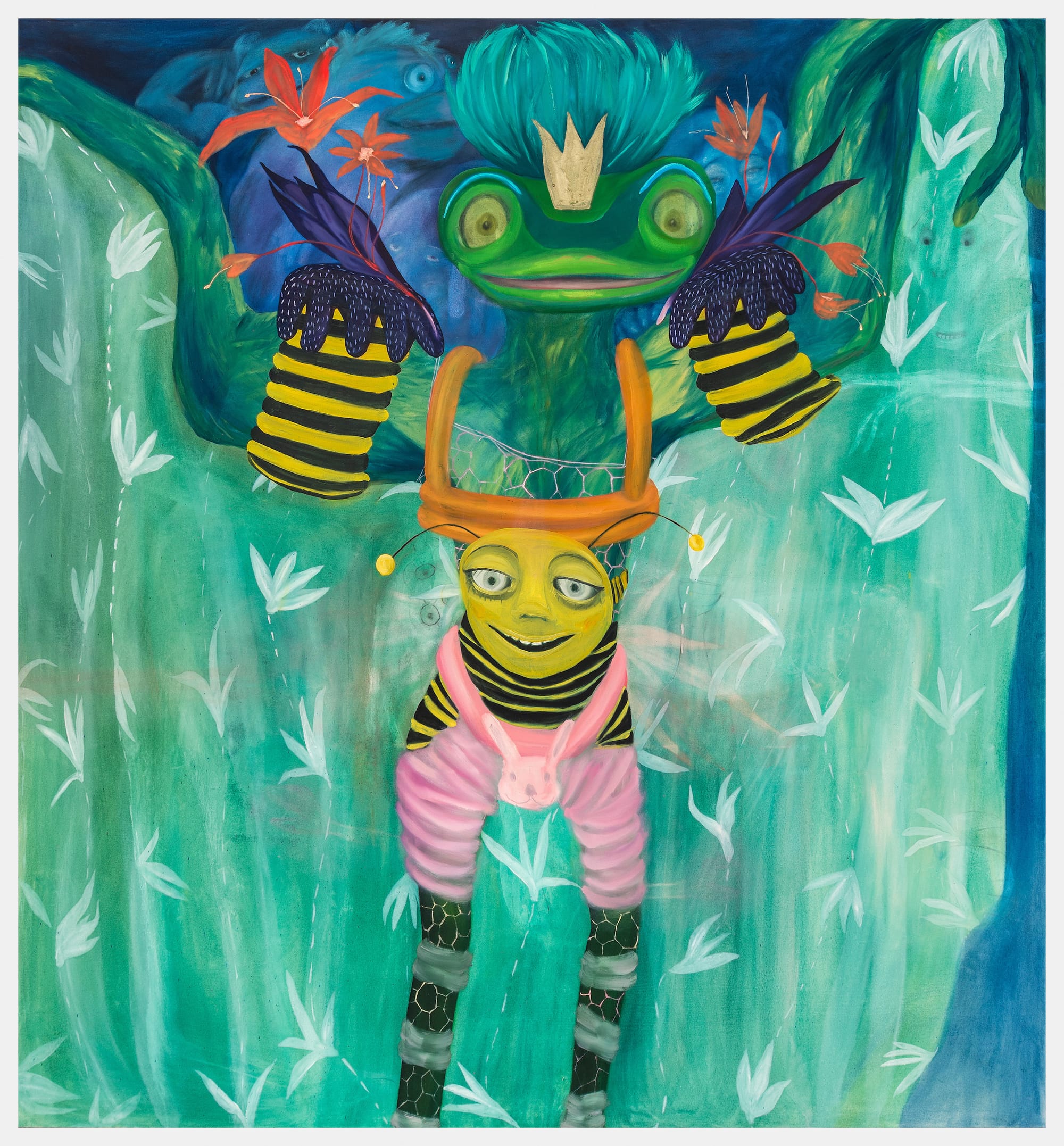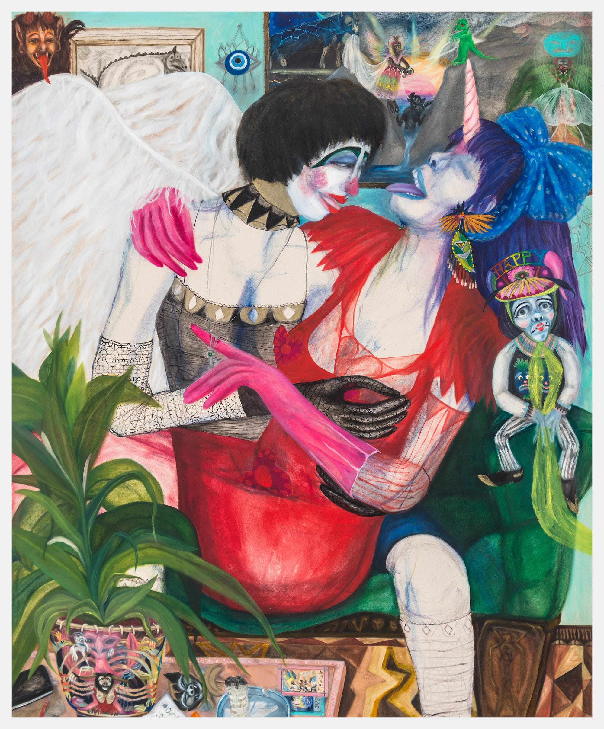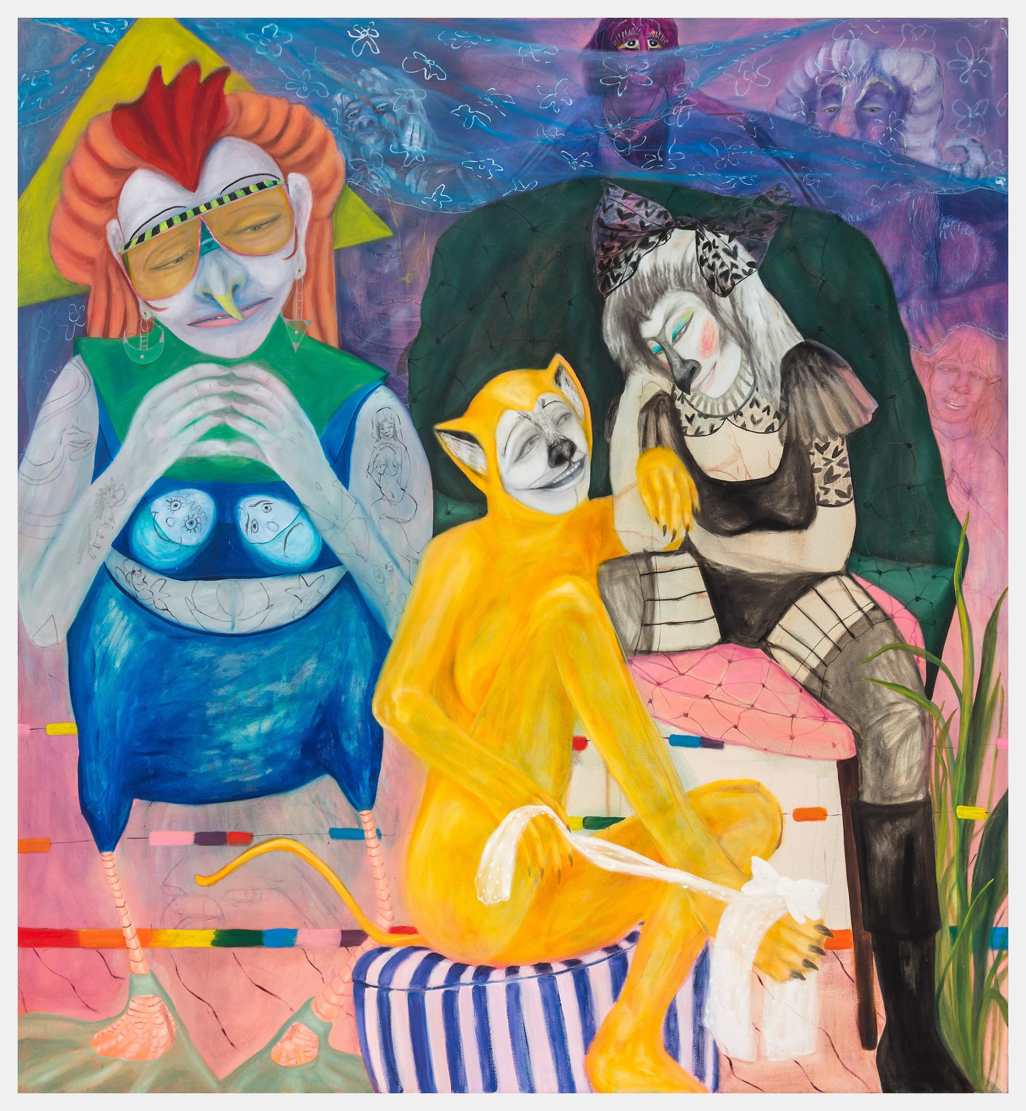 LOS ANGELES — Gazing upon the paintings of Lydia Maria Pfeffer’s Lily of the Valley at Ochi Projects, one feels as if they have stepped into another world. A festive place, a space for play — think Hieronymus Bosch sans the suffering and religious overtones. Here there is no moral condemnation for the figures on display, no plea for redemption. Instead Pfeffer has created a world more akin to Alice in Wonderland, Narnia, or Where the Wild Things Are. One could easily imagine the cast of part-human part-animal characters sprawled across her paintings coming to life only in children’s rooms after the lights are out and the adults are asleep.