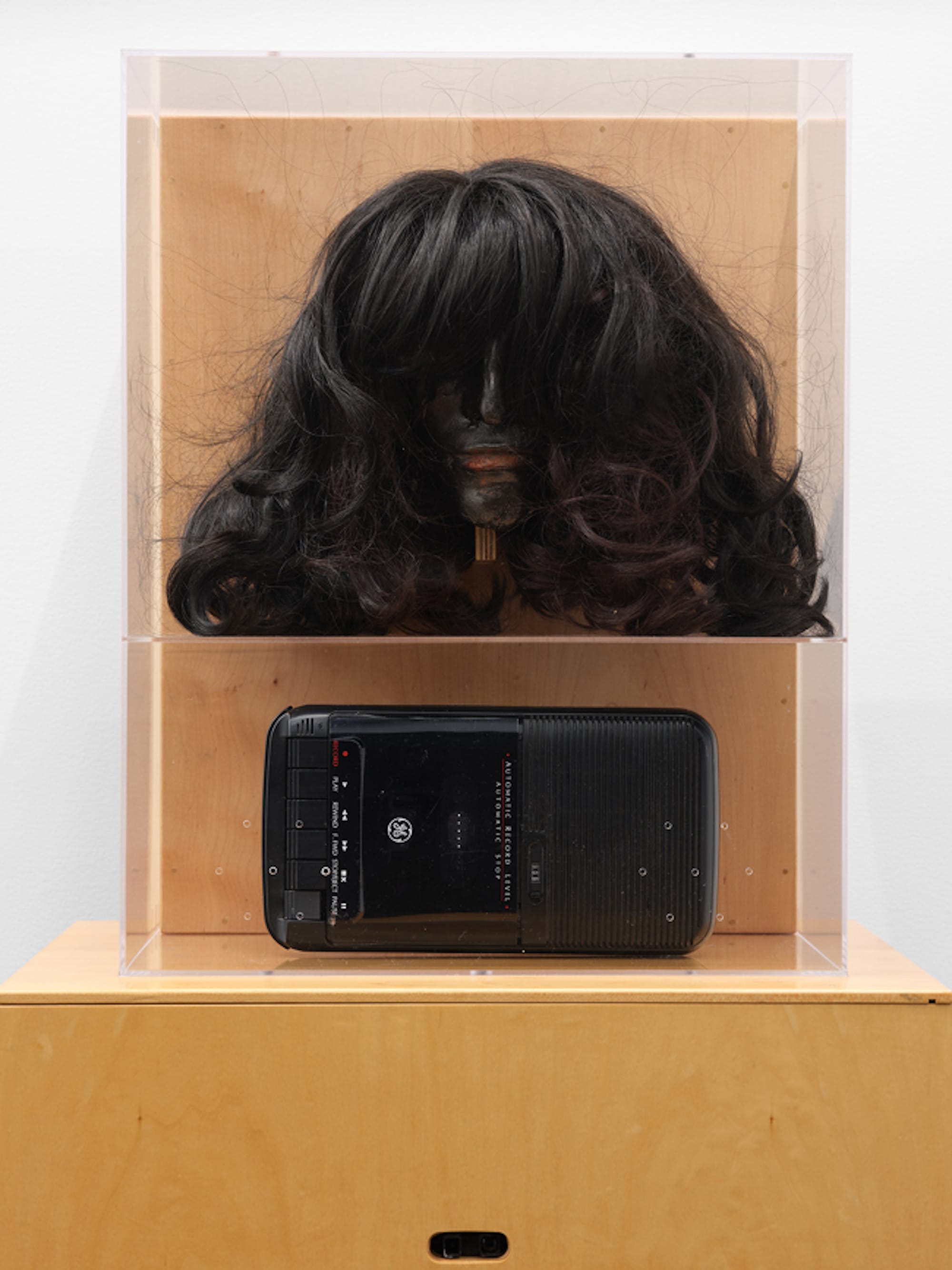 Walking through the exhibition before sitting down for an interview, Hershman Leeson pauses in front of a wax head with a wig, sensors, and a tape recorder.