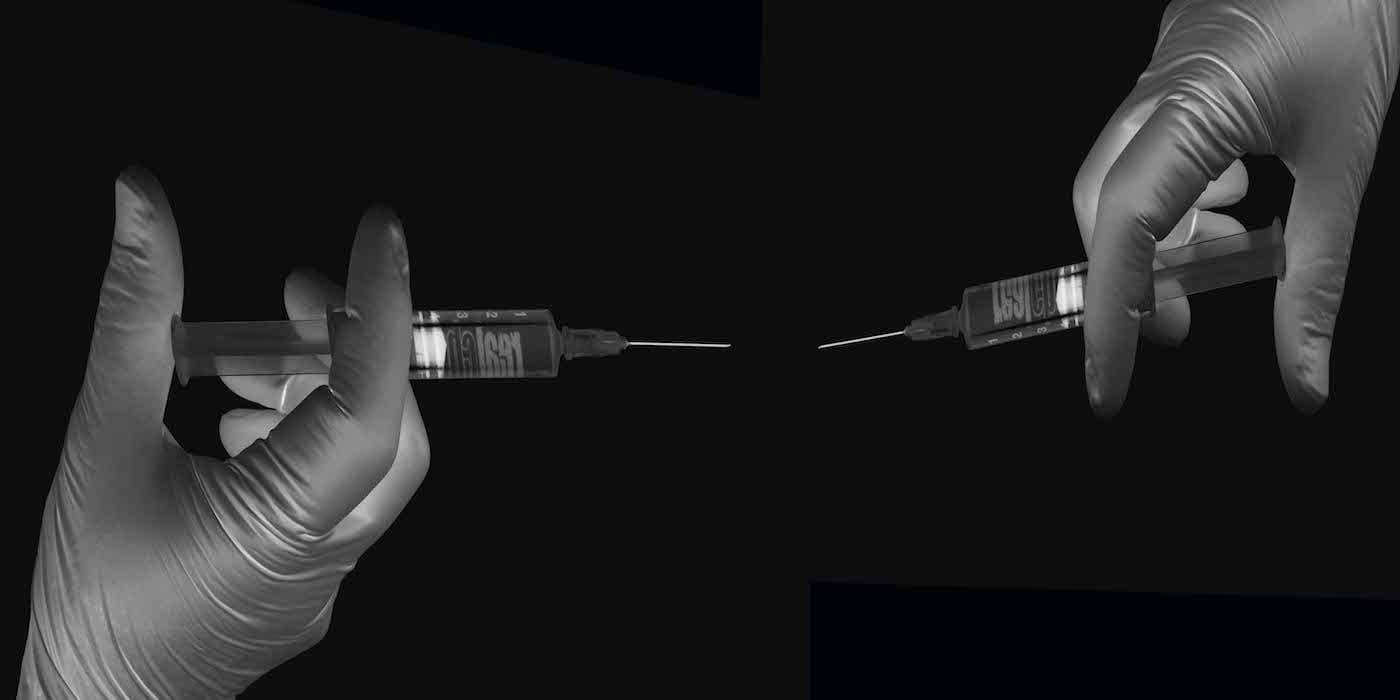 Leeson expands her exploration of identity and technology in her two new exhibitions that opened in Basel and Berlin last month. In Anti-Bodies, presented by Basel’s House of Electronic Arts (HeK), viewers are invited to don lab coats as they walk through the museum space, outfitted to feel like a laboratory: there are microscopes, file boxes, and scientists speaking about their work in video recording. A projector gives the illusion of a long, sterile hallway ending in a set of heavy, gray double doors. Another projector shows a giant image of two metal syringes about to touch tip-to-tip — Leeson’s play on Michelangelo’s Sistine Chapel fresco depicting Creation.