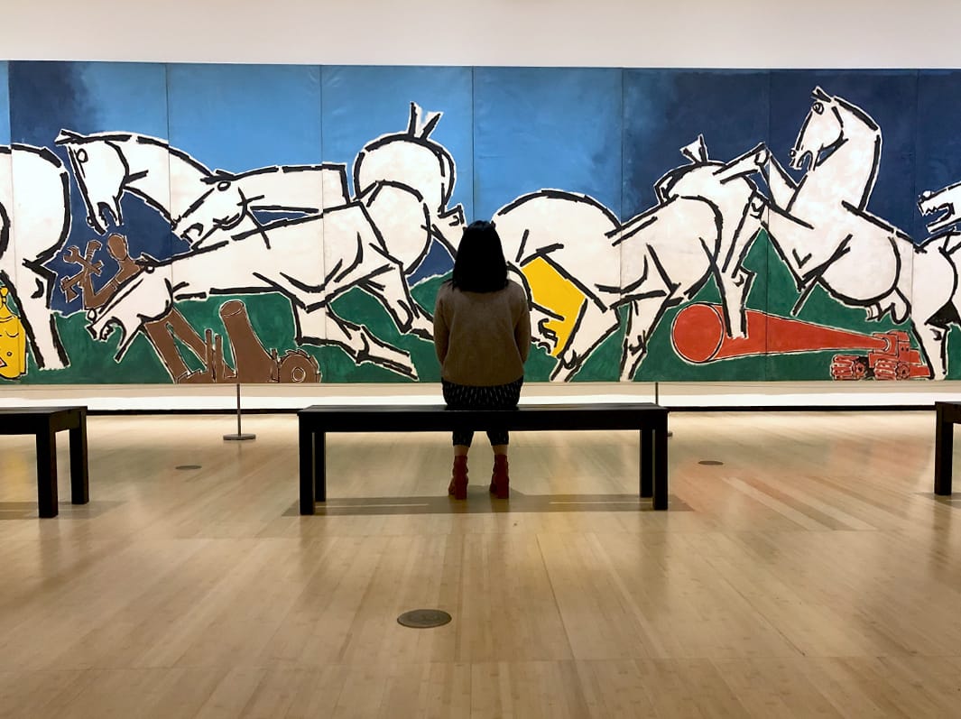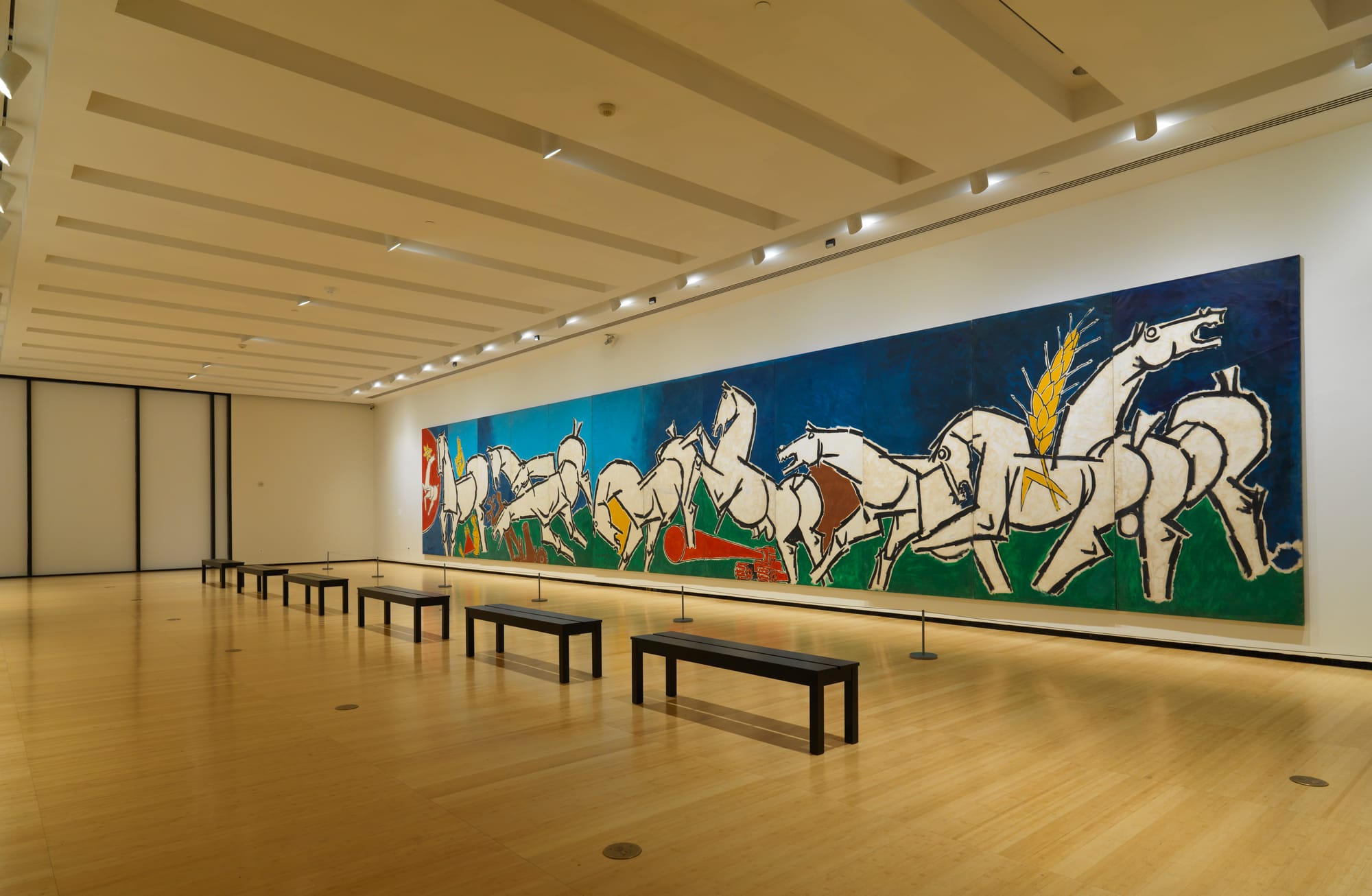 Art and the Nation, on view at the Asia Society in New York, focuses on Husain’s 12-panel painting. The panels are centrally displayed on the front wall of the gallery and are accompanied by two other works by Husain, as well as a photograph of the artist with the painting and a work depicting ancient sculptures of horses from which he drew inspiration. In relation to the overwhelming impact of “Lightning,” with its rich colors and symbolism, the additional works seem like unnecessary afterthoughts.