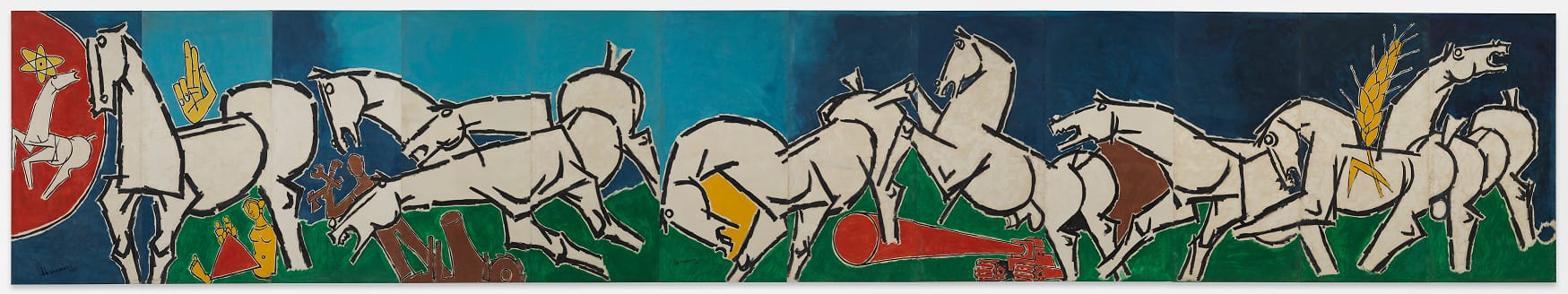 “Lightning” was painted for Indira Gandhi’s Congress Party rally of 1975. The painting includes plenty of symbols that refer to India’s history and modern strength. On the left, a yellow atomic symbol within a red semi-circle refers to India’s power as an atomic nation. While heavily stylized images of women and children hint at the country’s female population and family planning policies, the long horizontal picture plane is dominated by white horses painted with thick black outlines. The horses consume the panels, set against a minimal backdrop of blue sky and green land, that symbolize the nation’s booming progress after the 1947 Partition. Such symbols reflect Husain’s modernist works from the 1950s and ’60s, when he first became known for art that “represented the homeland.” Ultimately, though, the painting is a massive homage to Indira Gandhi, who was known for her monumental centralization of power, as the country grappled with political challenges in the 1970s.