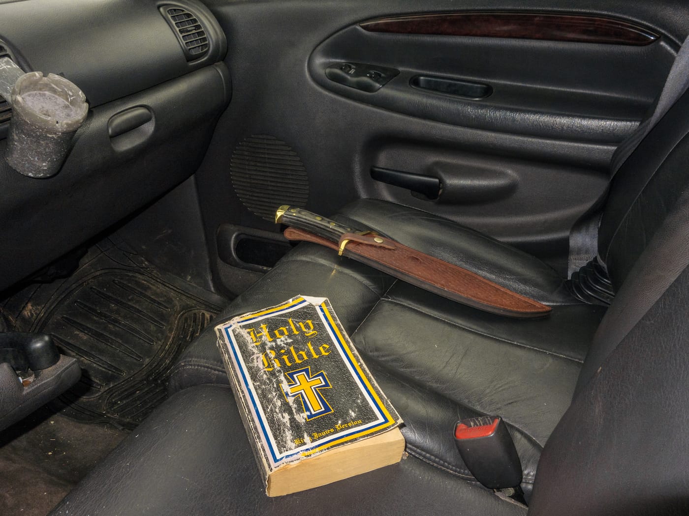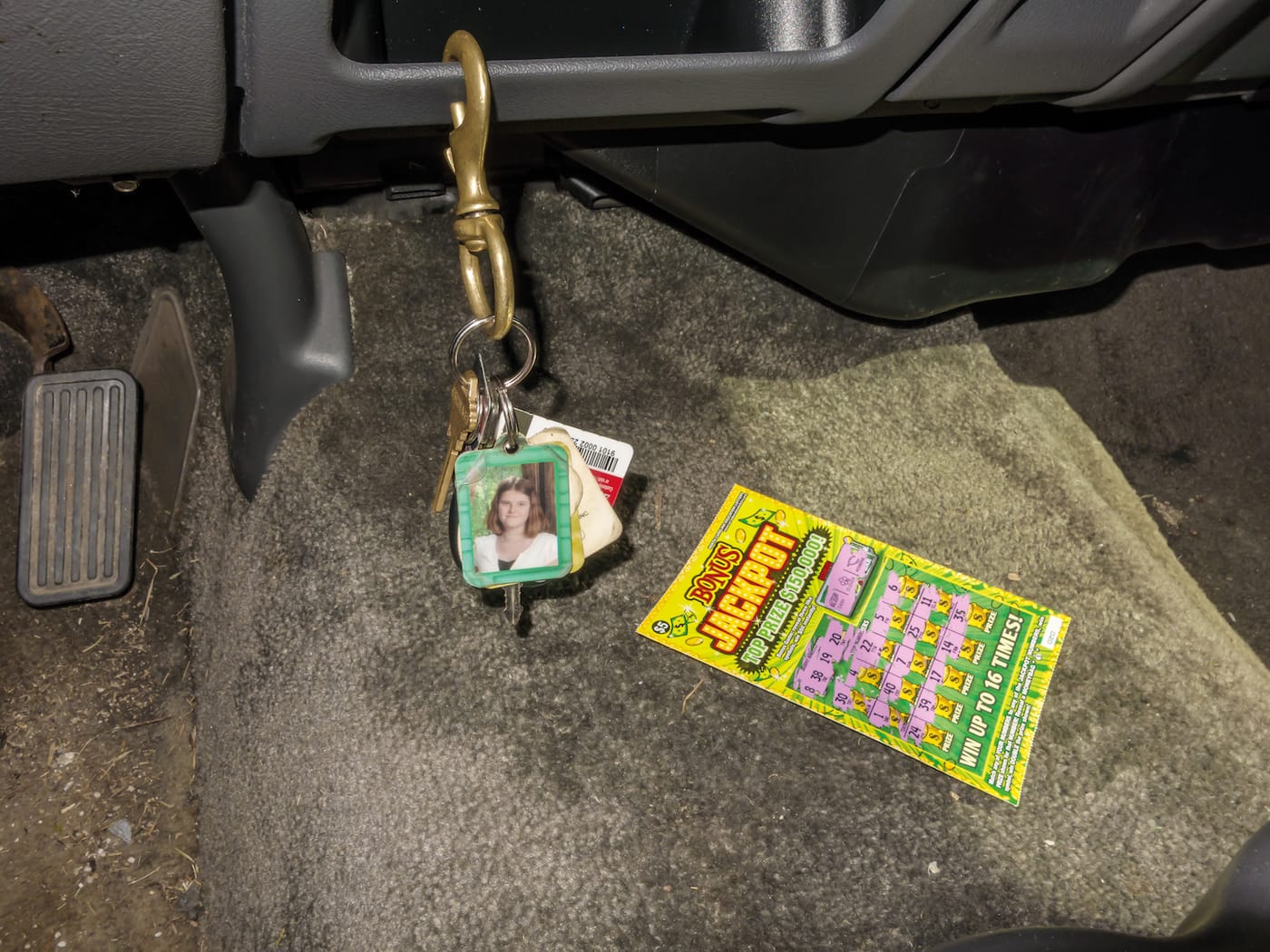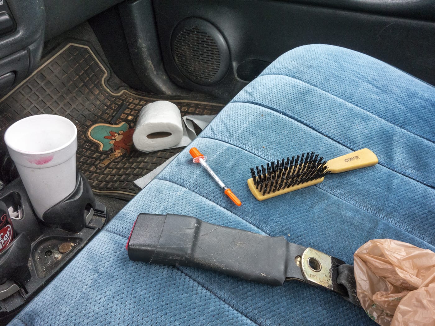 While the details that initially jump out, such as the hypodermic needles and an oxygen tube curled by a pack of cigarettes, suggest enduring pain (and recall that they were photographed at a hospital), there are also the signs of rebuilding. A few stapled white pages labeled “Wellness Recovery Action Plan” catch the light from the passenger window; a tiny American flag inscribed “Better days!!” rests on a console. Some cars are pristine, with just a baseball cap reading “Life Is Crap” or a box of tissues on the passenger seat hinting at ongoing healing. Other vehicles are grimy with signs they are being used as homes, with socks, underwear, toothbrushes, and empty food containers littering the floor.
