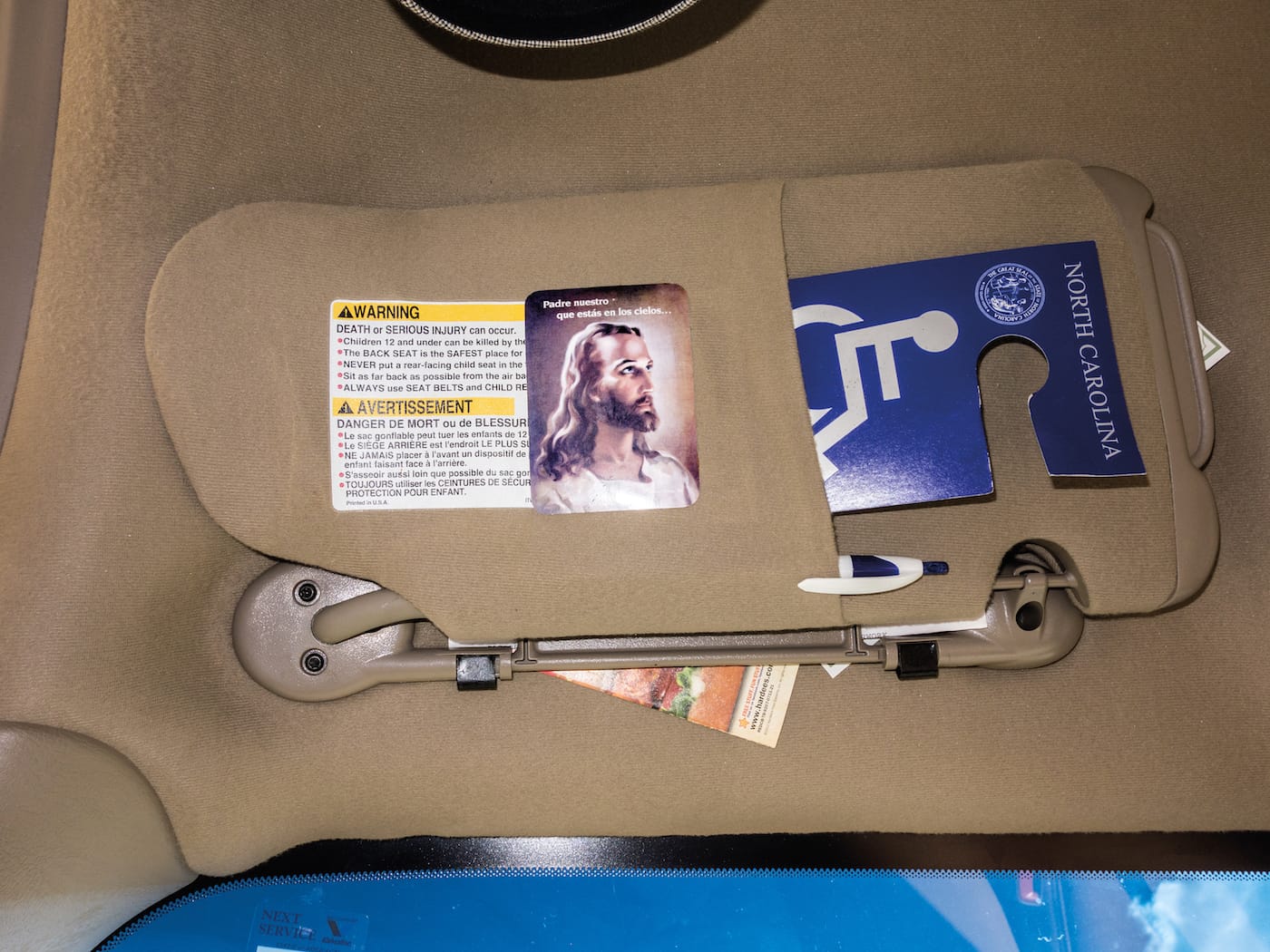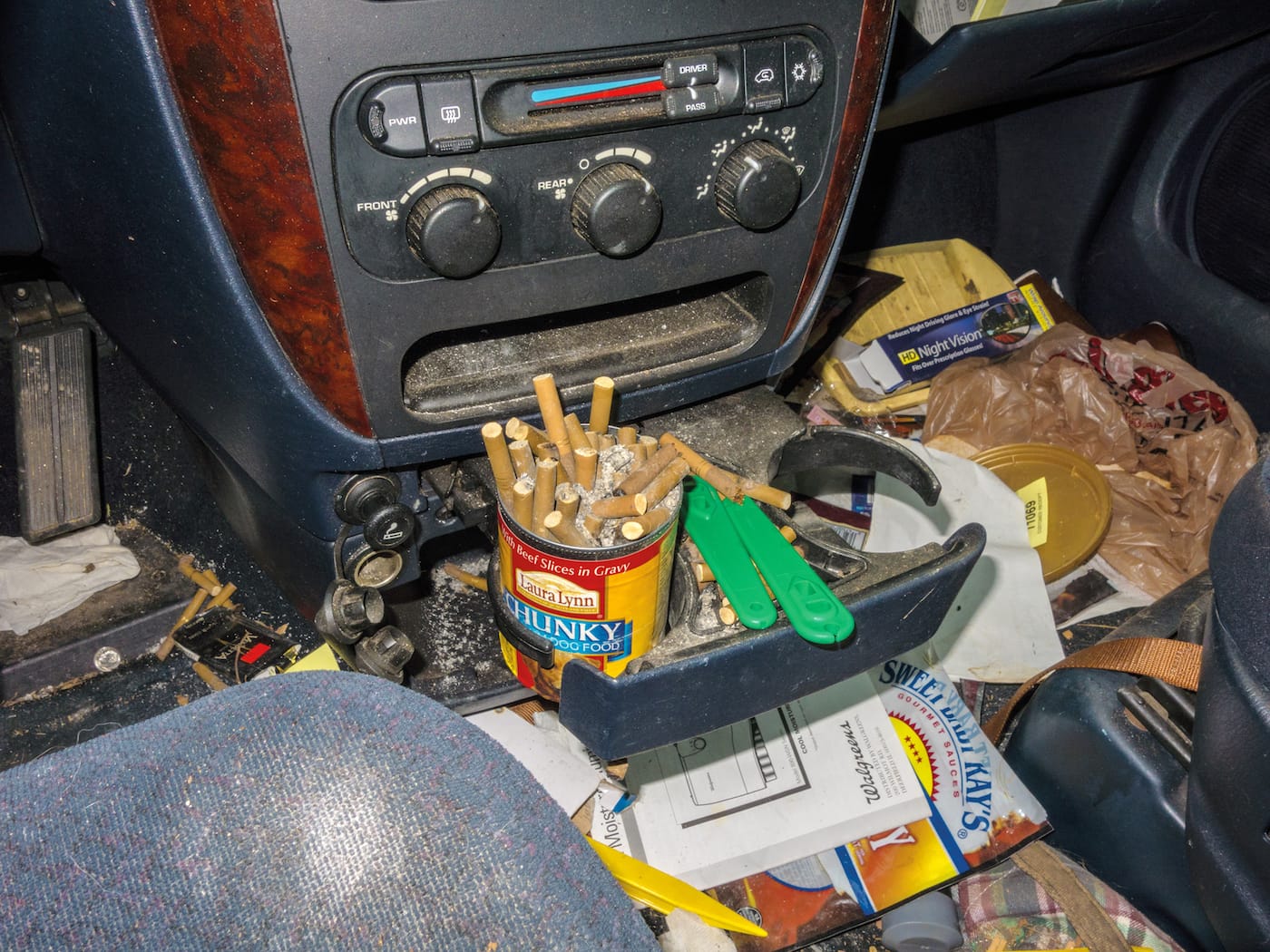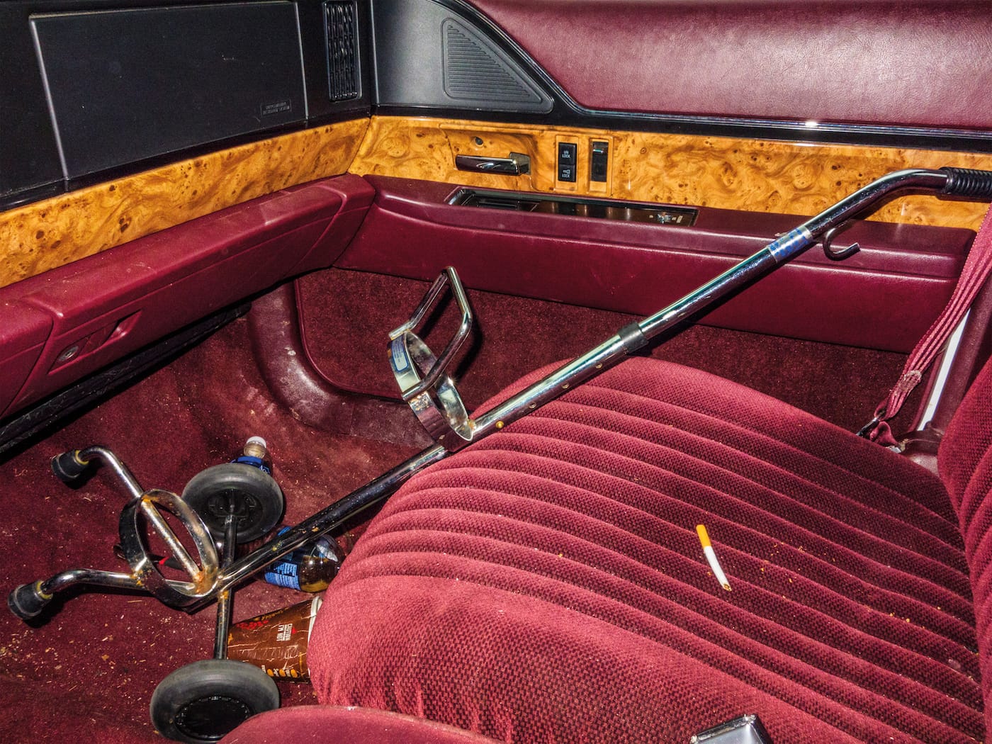 While the details that initially jump out, such as the hypodermic needles and an oxygen tube curled by a pack of cigarettes, suggest enduring pain (and recall that they were photographed at a hospital), there are also the signs of rebuilding. A few stapled white pages labeled “Wellness Recovery Action Plan” catch the light from the passenger window; a tiny American flag inscribed “Better days!!” rests on a console. Some cars are pristine, with just a baseball cap reading “Life Is Crap” or a box of tissues on the passenger seat hinting at ongoing healing. Other vehicles are grimy with signs they are being used as homes, with socks, underwear, toothbrushes, and empty food containers littering the floor.