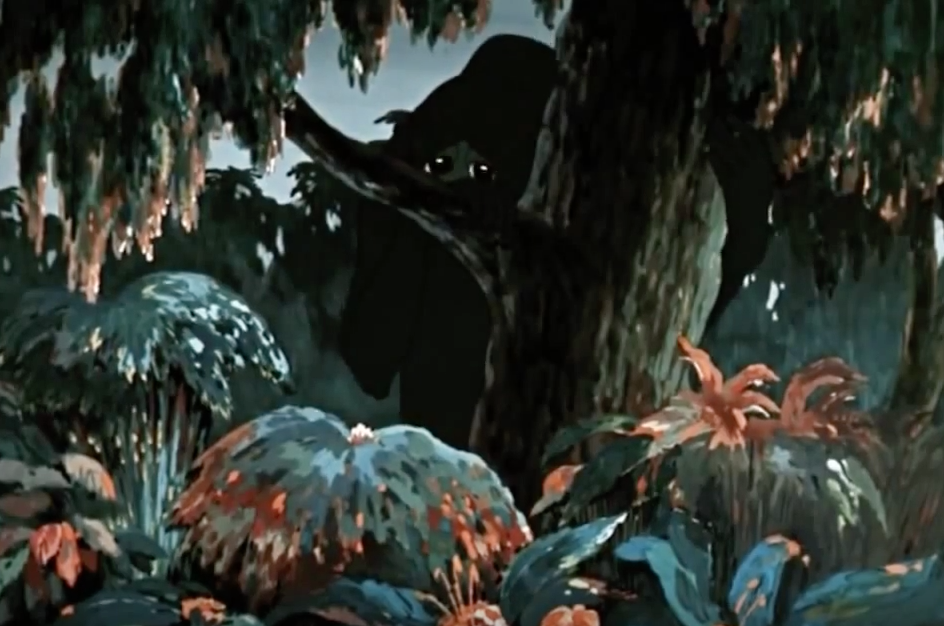 Upon my first encounter with it, the mural instantly called to mind a Russian folktale that I obsessed over as a child: an appropriation of the French fairytale Beauty and the Beast from 1740 (made famous by the Disney adaptation in 1991) titled The Scarlet Flower, by Sergey Aksakov, published almost a century later in 1858. In the Russian version, the beast is more gender ambiguous than the masculine figure Disney presents us, and in The Scarlet Flower it lives in a gorgeous, lush landscape. The film animation of this tale shows various scenes in which the beast observes his object of desire from behind the flora and fauna — with only the eyes visible to the viewer. The Russian beauty, named Nastenka, ends up falling in love with the beast without ever seeing his full appearance.