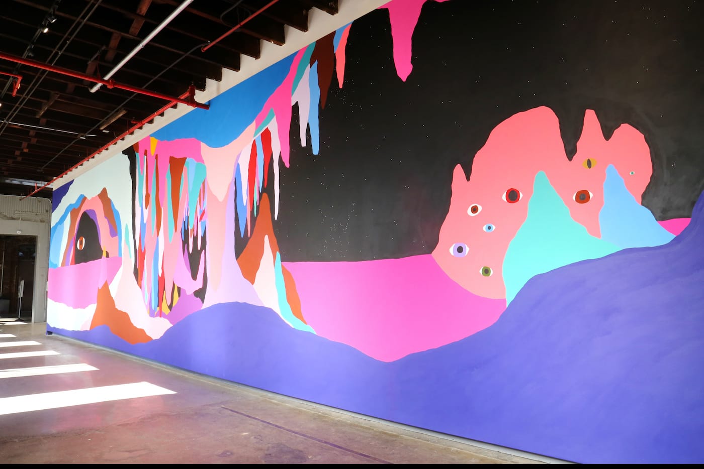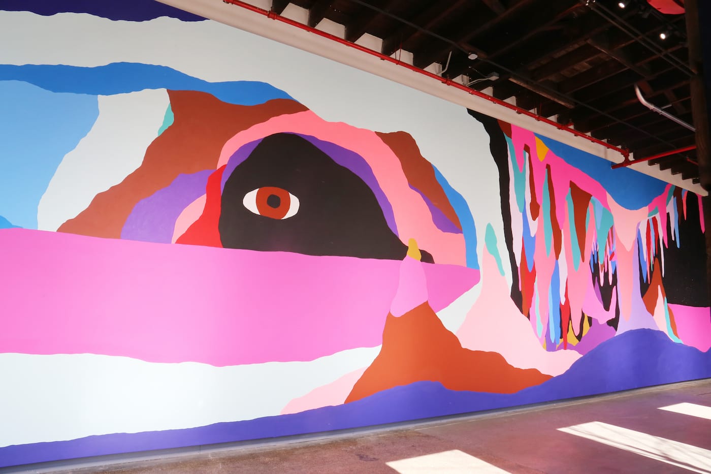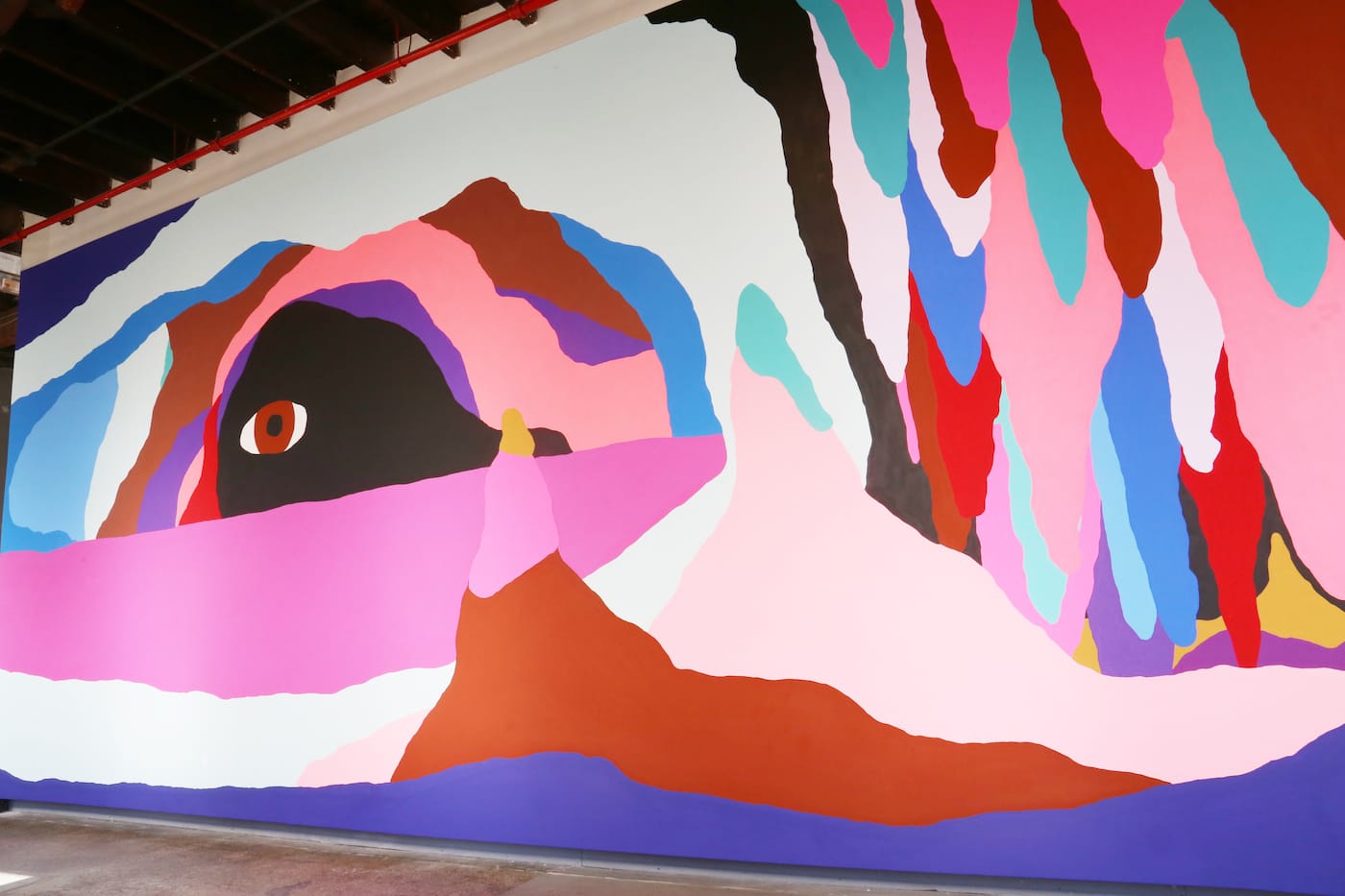 While flirting with abstraction, Who Is Watching You More Than You Are Watching You is undeniably representational. Reed has here depicted a series of caves surrounded by mineral formations known as stalactites and stalagmites, but the main subjects are a series of eyes staring at us from inside the caves. In 2016, Reed undertook a solo project at ICA Baltimore titled “Who’s Afraid of Magic?”. While the title of this earlier project was a more open-ended question, the “who” of Reed’s mural at the Knockdown Center is represented in the work itself — and this “who” is watching you more than you are watching yourself. While we could speculate on how this title might play into our current political climate of constant surveillance, the exhibition’s description suggests that Reed’s mural “combines the threat of extinction of popularly known species of plants and animals to the extinction of a more intangible nature: the cognitive space of the imaginary.” Perhaps this is what prompted me to embark on a more imaginative reading of the work.