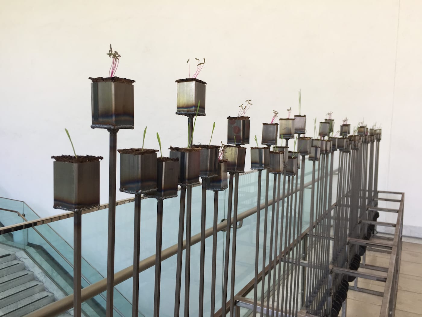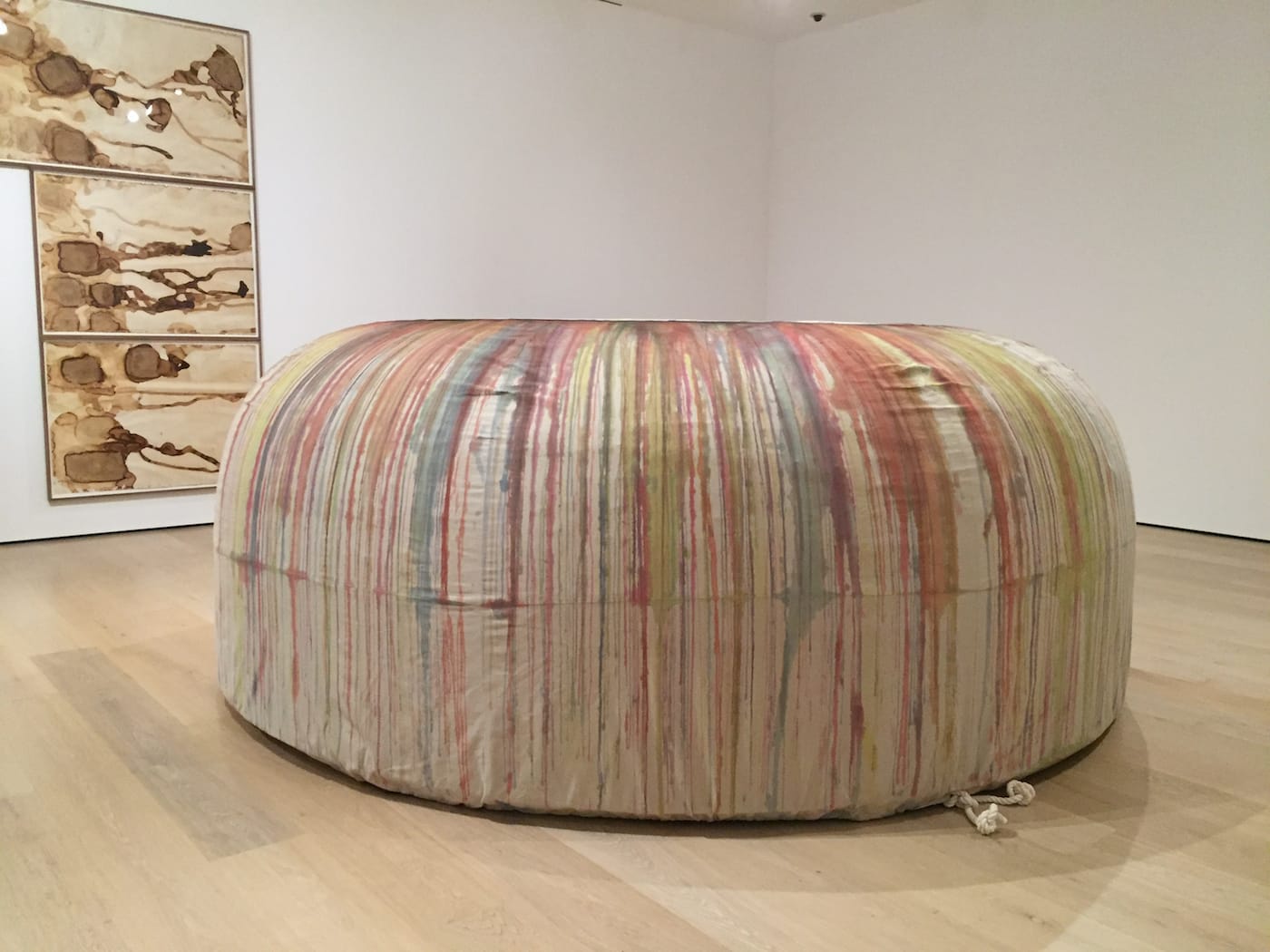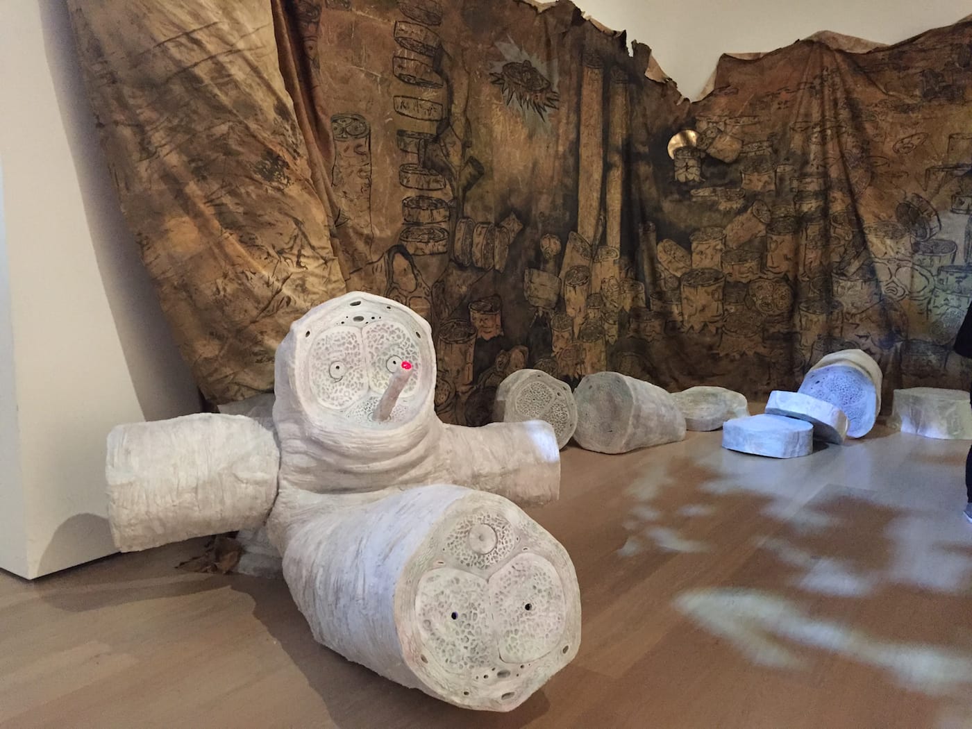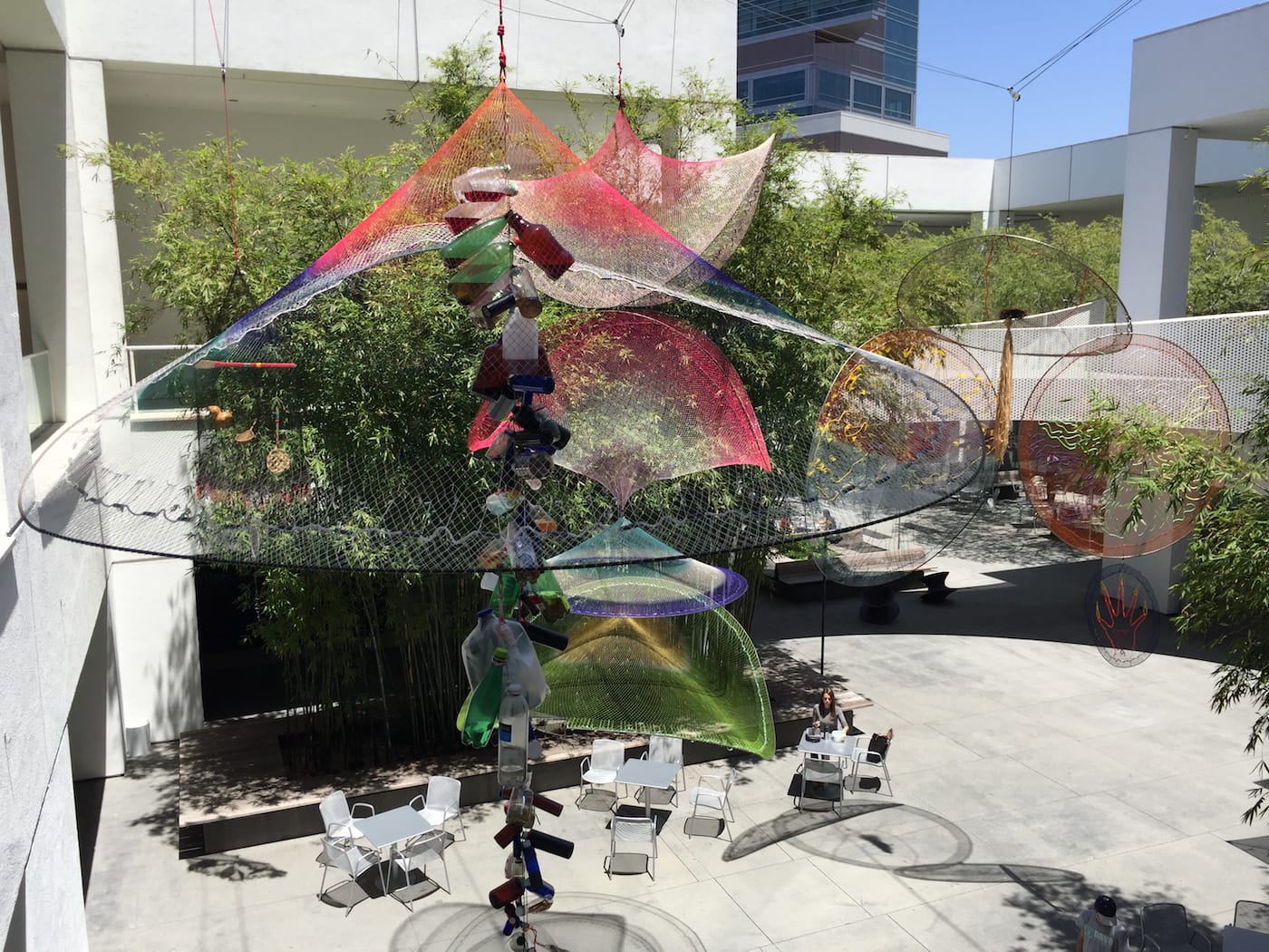 Hanging over the central courtyard, Carolina Caycedo’s gossamer assemblages are made from fishing nets gathered in Colombia, Guatemala, Brazil, and Mexico — Latin American countries where Caycedo has documented the deleterious ecological and social effects that dams have had on various waterways and the indigenous populations that rely on them to survive.