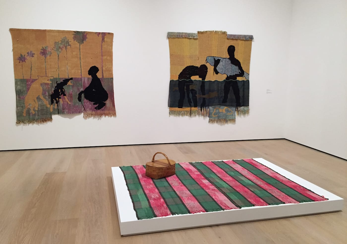 Issues of identity — hybrid, intersectional, and complicated — are also taken up by several artists like Tongva artist Mercedes Dorame, whose photographs document the Malibu home that her non-Native grandparents live in, sited on land that once belonged to the Tongva. Another series chronicles her father’s work as a cultural resource consultant, helping relocate native artifacts once they are discovered on construction sites. African American artist Diedrick Brackens incorporates both European and West African weaving techniques into his textiles works, fusing strands of his lineage in works that depict autobiographical scenes.