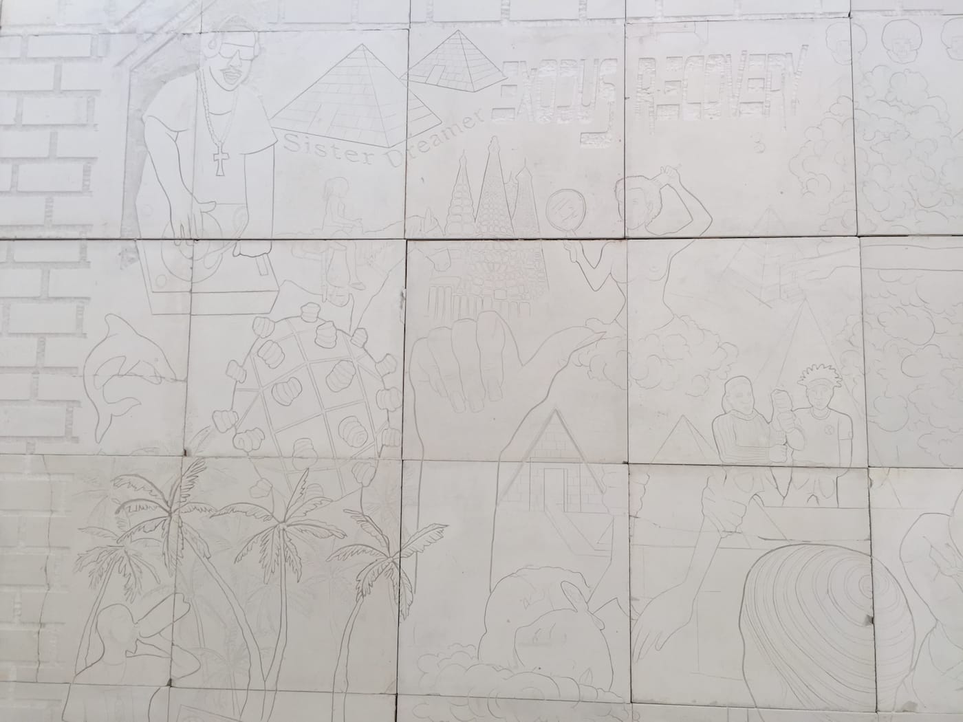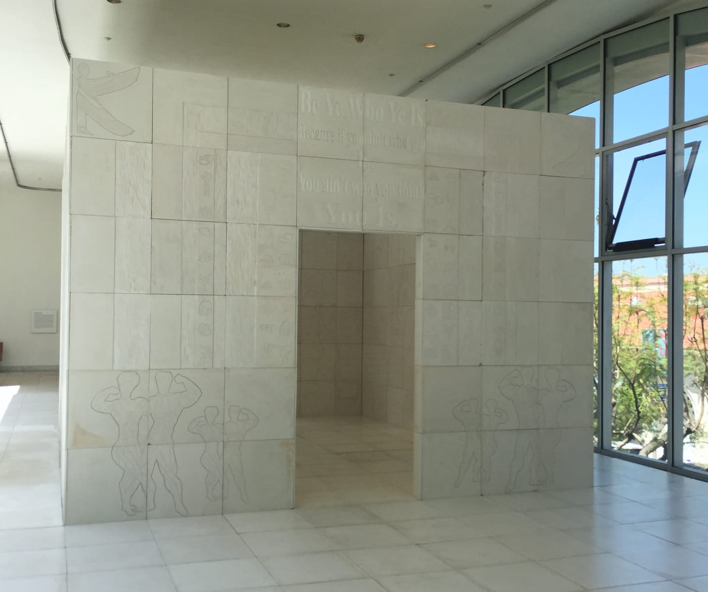 Other artists only imply the body, creating sculptures or environments that invite participation from viewers, or stand in as evidence of past events or uncharted histories. Lauren Halsey’s “Crenshaw District Hieroglyph Project” features 600 white gypsum boards onto the surface of which the artist has carved images of Afro-Futurist utopia, signs and scenes from her South Los Angeles neighborhood, and the names of African Americans killed by police. Assembled into a temple-like structure that visitors can walk through, it is a prototype for a larger edifice that will function as a cultural center and gathering place in South Los Angeles.