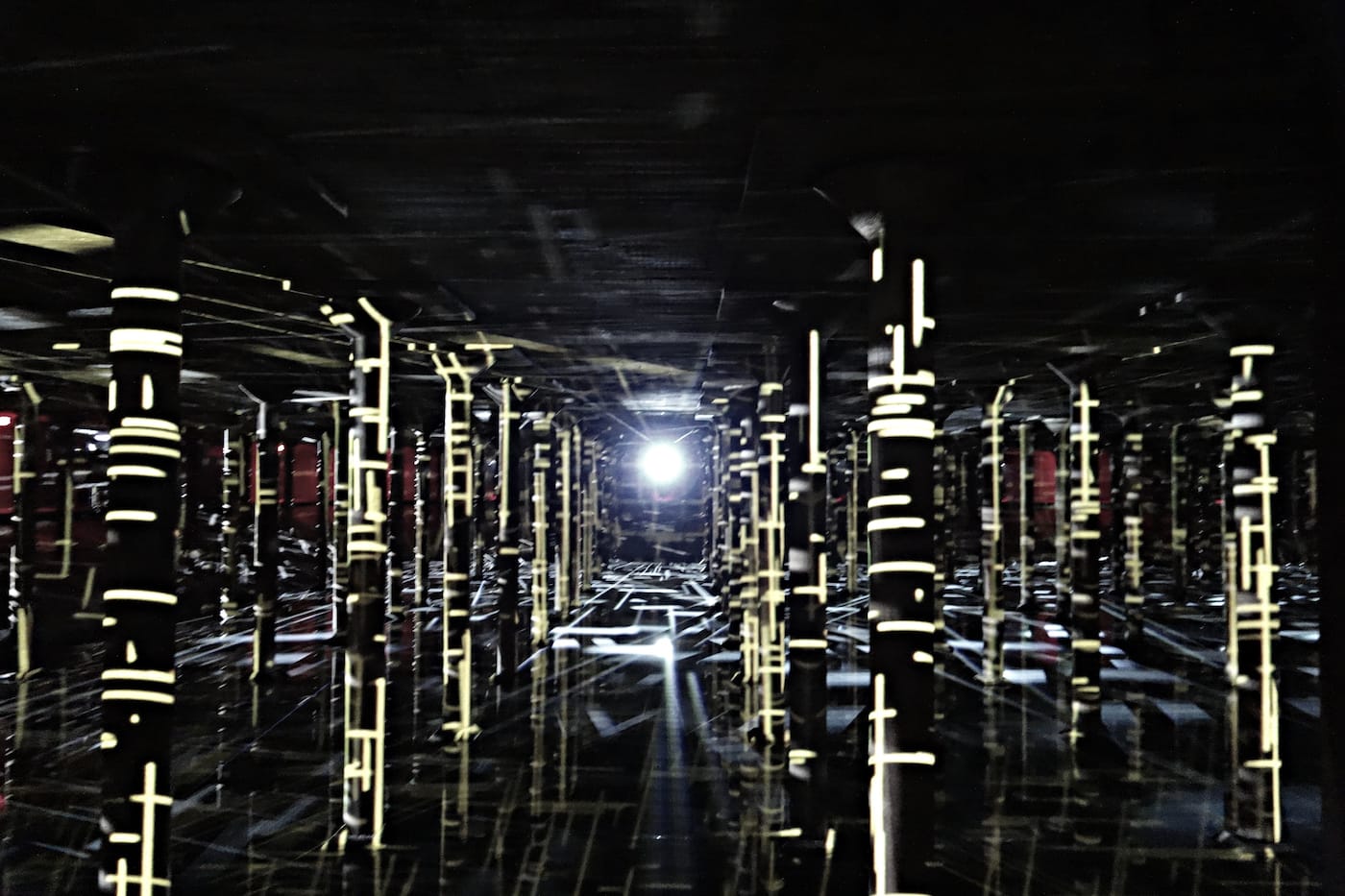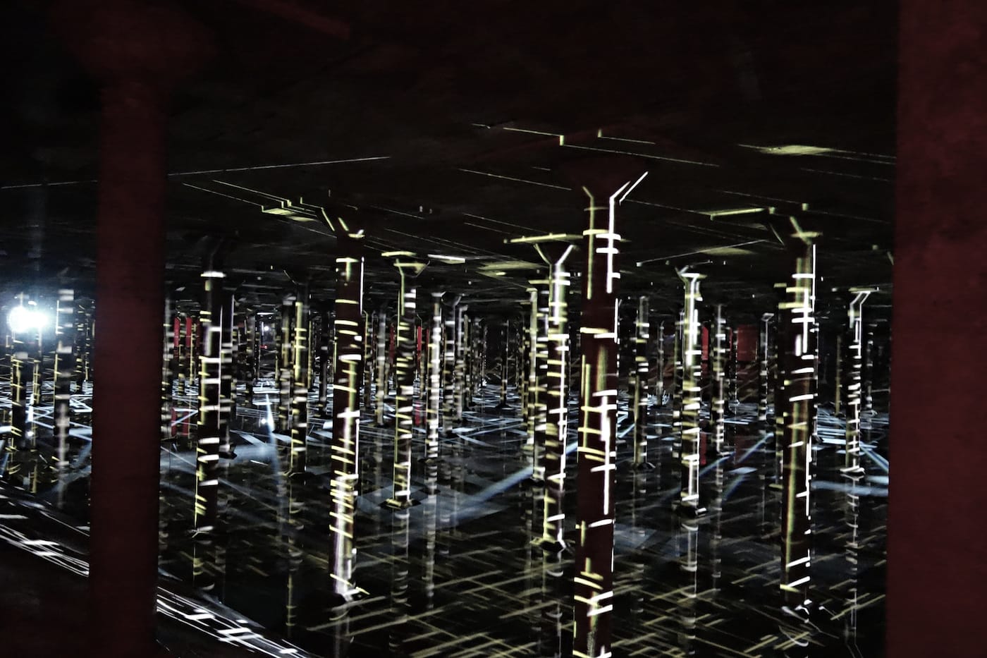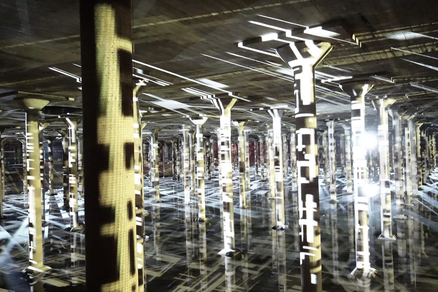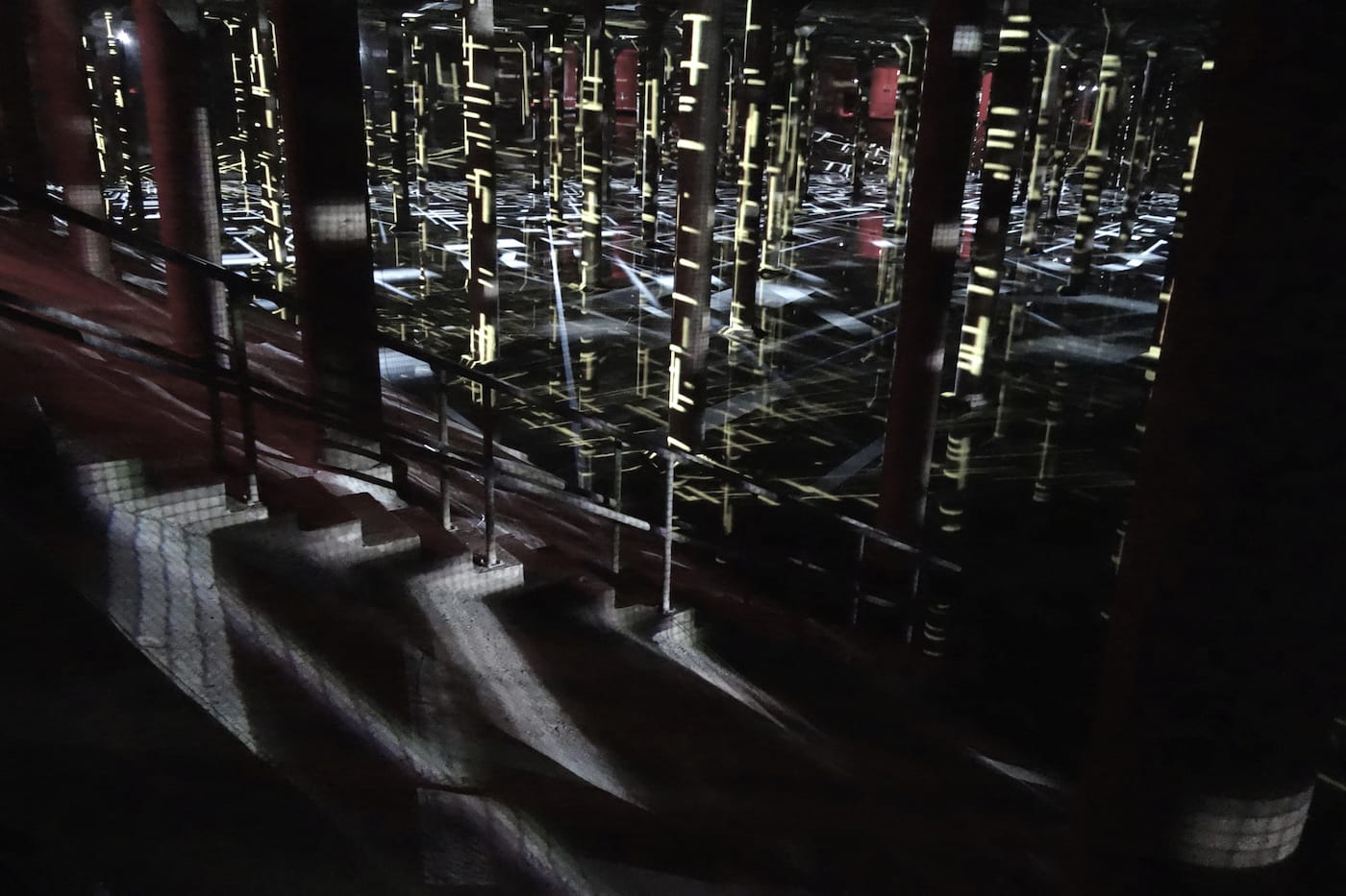 In the museum it was installed against the walls of a gallery; here the exponential shapes, inspired by the black and white forms of Piet Mondrian’s 1917 “Composition in Line,” warp over the columns and are infinitely reflected in the shallow water that fills the bottom of the Cistern. As your eyes adjust, sharper details of looping digital animation appear, each time fading again into a deep darkness that reminds you of the subterranean nature of the once-forgotten industrial space.