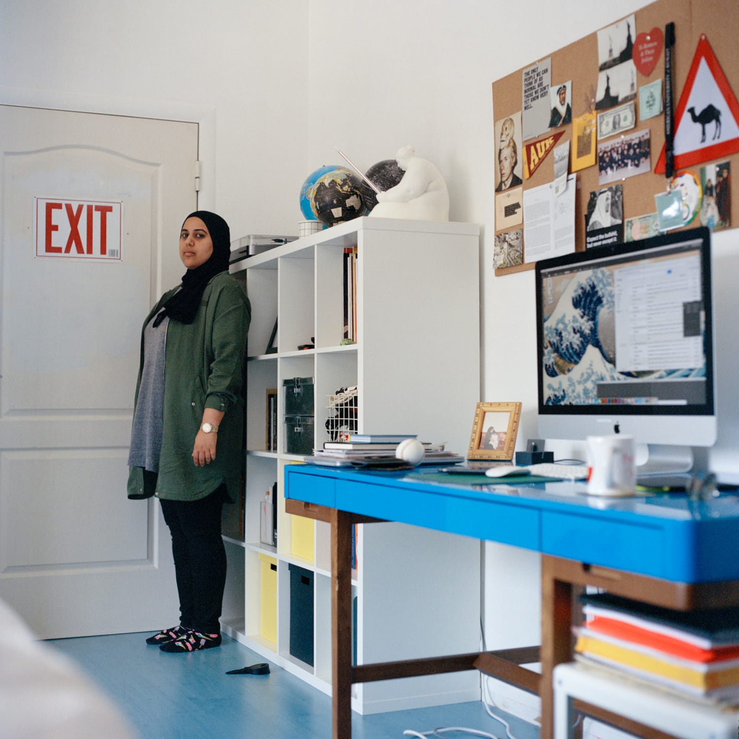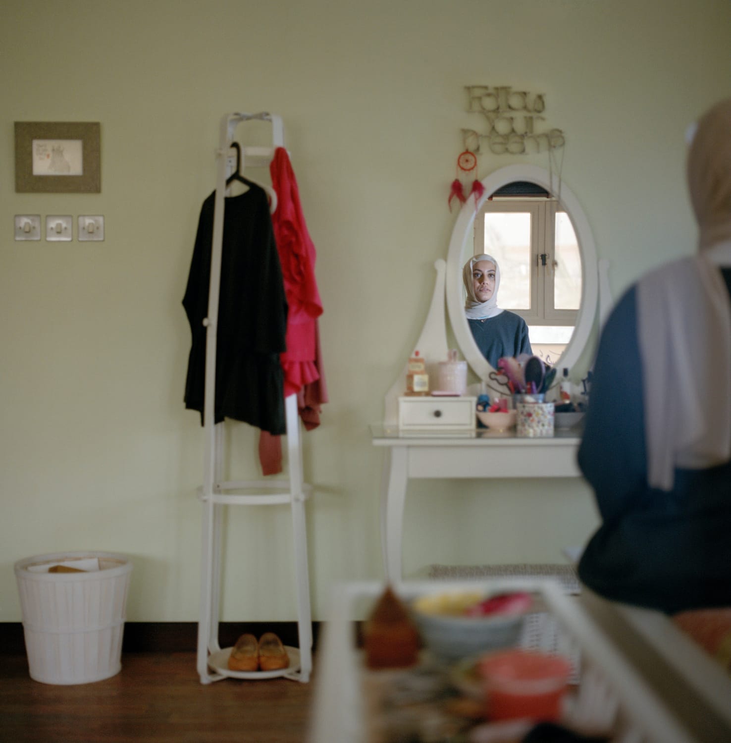 “Our constitution gives a certain amount of rights to each citizen and we as women are not given all these rights, only some of them,” says Mariam Mandani, a 25-year-old freelance designer who’s captured half-eying the camera next to her bedroom door. “It’s as if we are less of citizens than men,” she continues. At the top right corner of the photo, above her desk, you can see a tongue-in-cheek traffic sign warning of camels crossing the road. A large emergency “EXIT” sign posted on the door subtly suggests a desire to escape or break free.