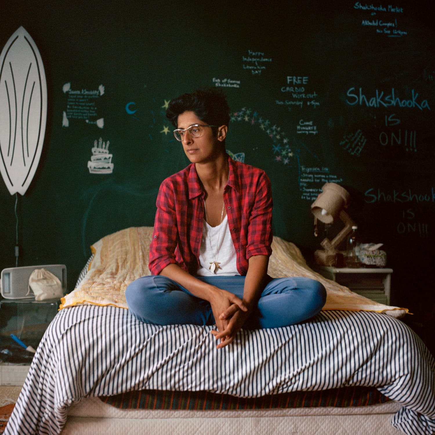 Djinane Alsuwayeh, a 29-year-old art director and photographer, is captured in a pensive moment, her eyes downcast. She is seated on her bed, surrounded by pillows, against a turned canvas and a warm oxblood red wall centered by a black-and-white photo of a woman in a white dress. “Women are not equal to men,” she says in her interview. “You see it every day in the way kids are being raised, at work and in conversations.”