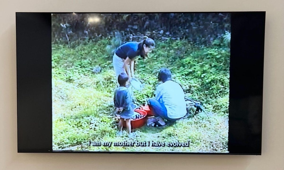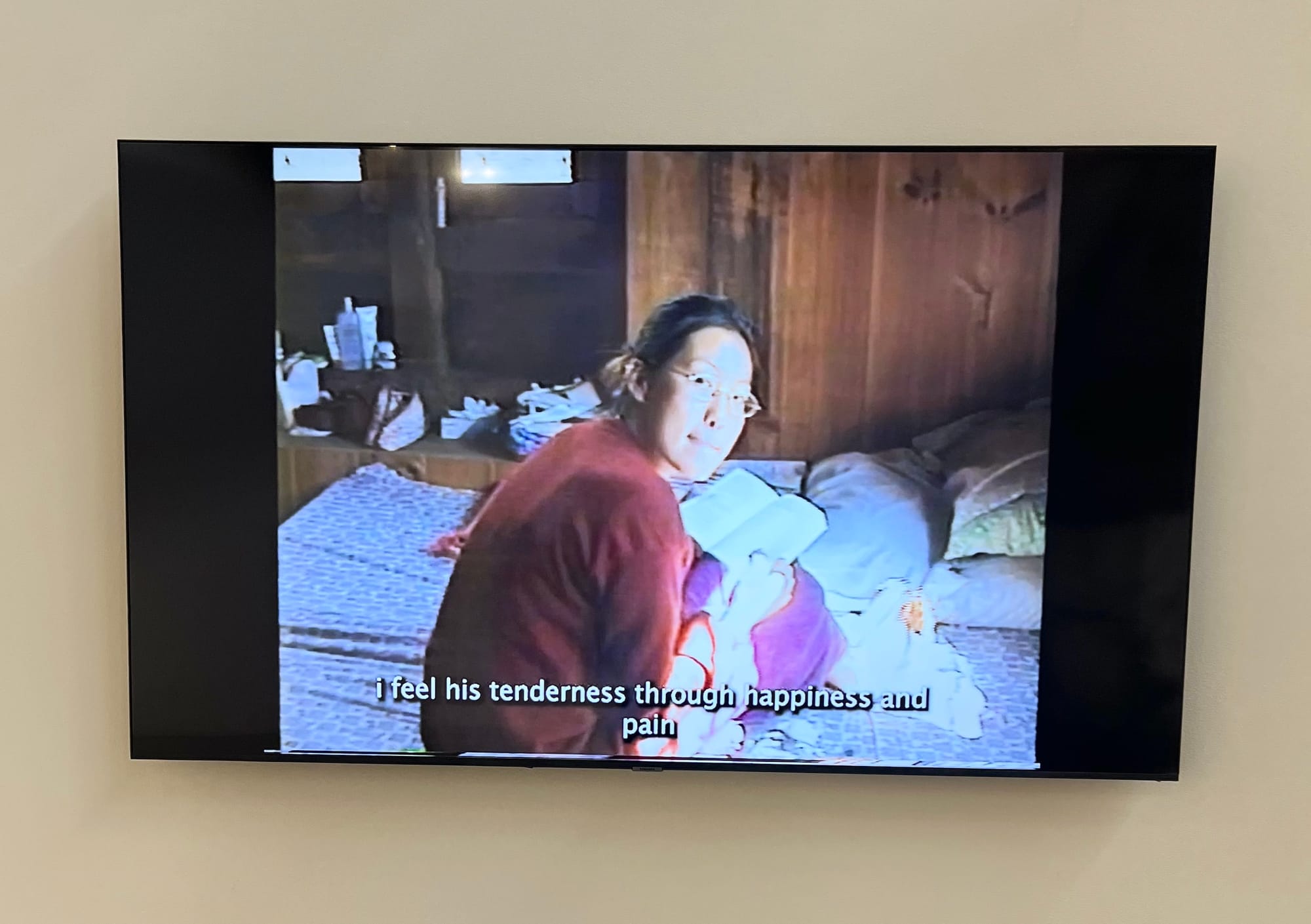 The video series comprises home videos shot by Lee’s father during the 1990s that capture their family’s daily life while living in rural Nepal, spliced and disjointed to fracture any linear narrative. In the video “The Stranger” (2018), the artist considers generational mirroring through her relationship with her mother as it reflects back on her experience of becoming a mother herself. Her father reads a monologue in Korean, where Lee describes postpartum physical and psychological afflictions, along with wishes for her future self and child. A letter to the child, titled “How to Be Sensitive,” describes her hope to encourage softness and empathy in them, embodying evolved maternal patterns. In “The Letter” (2023), subtitles transcribe letters Lee sent her friends during the pandemic that address feelings of longing and dislocation as she reminisces on shifting ideas of what home means. And in “The Line” (2024), an astrological natal chart reading, narrated in English by an unnamed astrologer, describes the inherited spiritual lessons Lee must contend with, especially in terms of fate and generational legacy. Across three different languages and homes, the videos replicate the incomplete expression of memory as it interweaves with Lee’s identities as an artist, daughter, and mother.