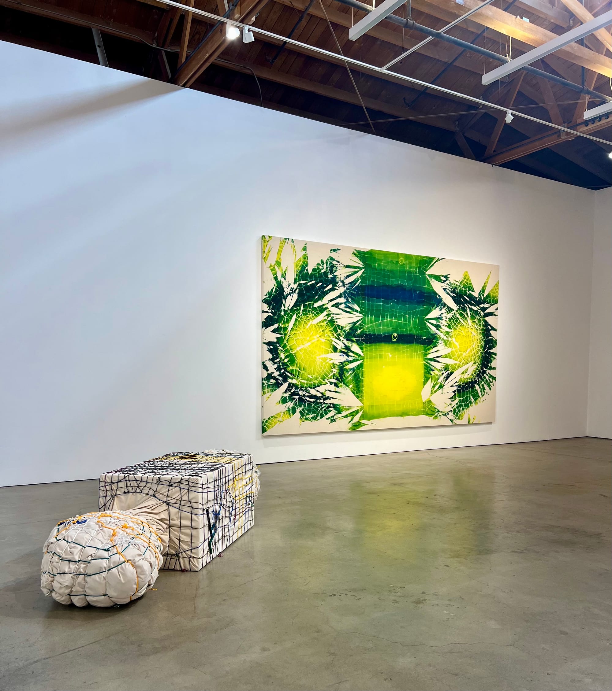 Lee’s artworks form an ecosystem, informing and modifying each other as she moves through life stages and sites. This presentation of the Bondage Baggage (B.B.) series, which includes both paintings and sculptures, marks a clear development in her use of scale and color. For her Bondage Baggage paintings, the artist begins by painting wrapped structures in acrylic pigment and letting the paint dry around the empty spaces of rope, before cutting the net to reveal a burst-like motif that maps the negative space left behind. For the wrapped sculptures, Lee bundles parcels in sheets of plastic, burlap, or canvas before securing their contents with a rope-like cord tied in a tight net pattern. Whereas her earlier paintings were monochrome and her sculptures consisted of monolithic objects, “B.B.Earth”(2024) sports vibrant, almost neon, shades of yellow, green, and blue, while its accompanying sculpture, “B.B.Time_Until Liberation 2” (2024), takes the form of one rectangular parcel with two spheres on adjoining ends, perhaps representing Lee, her partner, and her child.