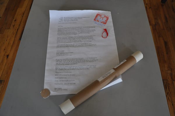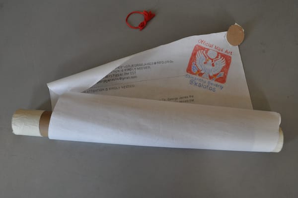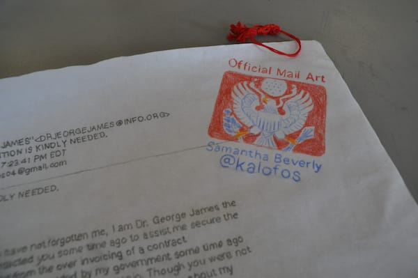Samantha Beverly (aka @kalofos) has created the funniest example of mail art that has arrived at Hyperallergic HQ yet. In her contribution to the Mail Art Bulletin, Beverly has transformed the greatest piece of contemporary spam — the West African email scam — into a hand-drawn scroll complete with crest and tassled string.