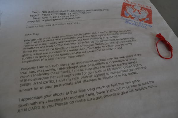 Samantha Beverly (aka @kalofos) has created the funniest example of mail art that has arrived at Hyperallergic HQ yet. In her contribution to the Mail Art Bulletin, Beverly has transformed the greatest piece of contemporary spam — the West African email scam — into a hand-drawn scroll complete with