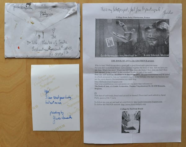 To me, the most interesting mail art has been those works that have played with the process of opening mail, making us notice the excitement that comes with a closed box or a sealed envelope. It’s the interactivity and the unveiling process that matters, the experience of seeing the object unfold.