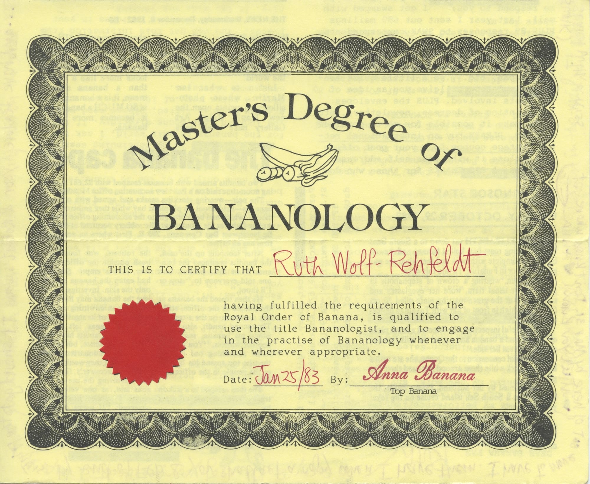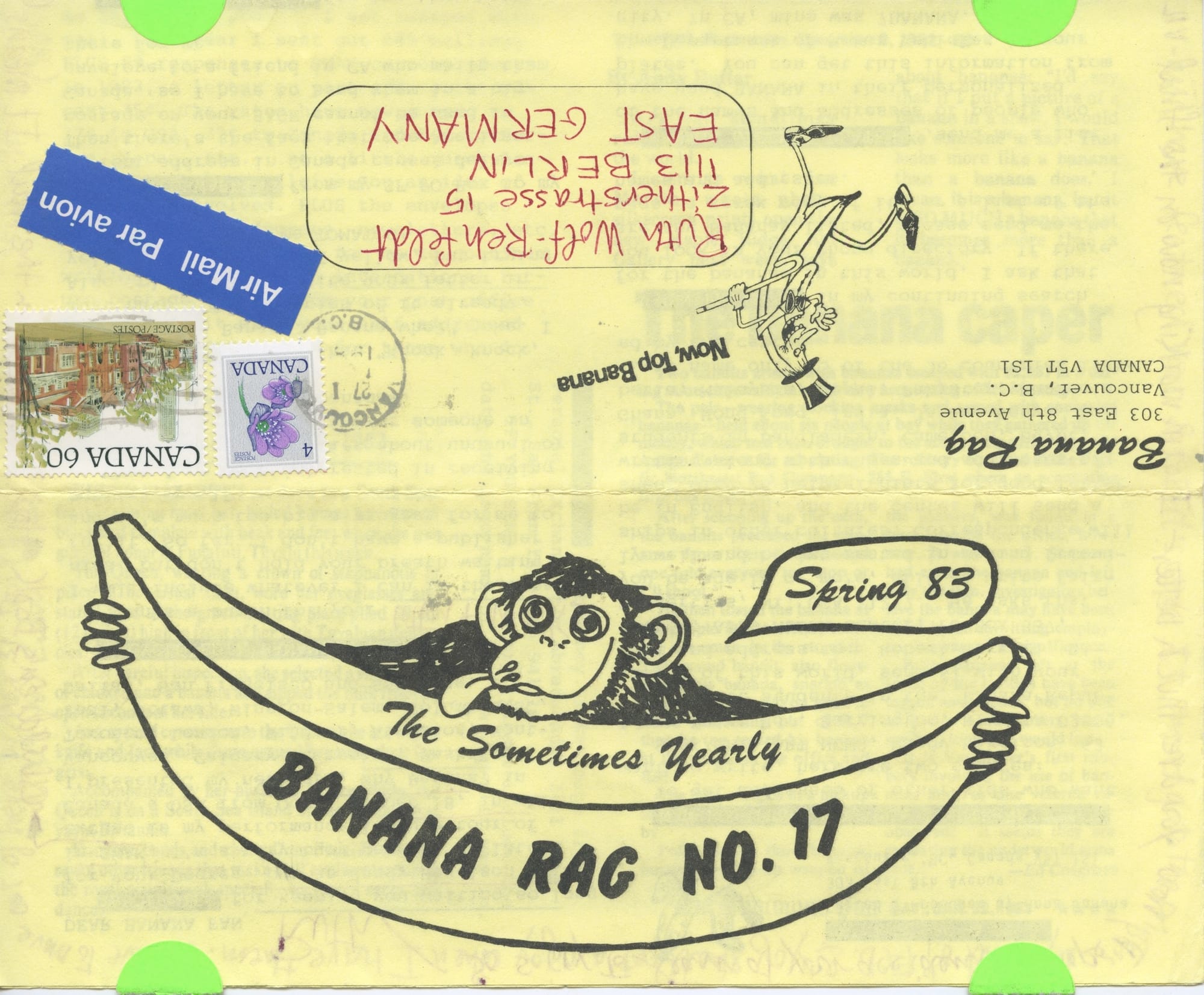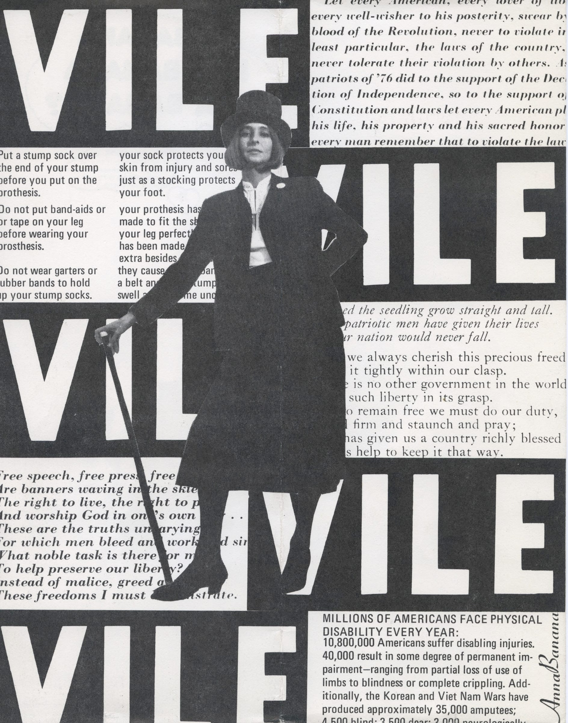 She’d begun as a textile artist but turned to more participatory forms in the 1970s. In 1971, Banana launched the absurdist Banana Rag, a newsletter which connected her to the International Mail Art Network (IMAN). In 1973, she moved to San Francisco, mixing with Bay Area Dadaists such as Bill Gaglione and publishing VILE magazine, which documented the international mail art circle, a critical response to General Idea’s FILE magazine (itself a riff on Life) that had since let go of its correspondence art roots. She operated Banana Productions, which published the International Art Post, and she referred to her title there as “Top Banana.”