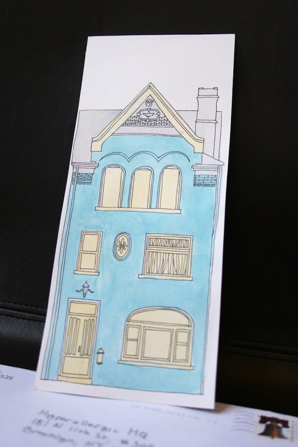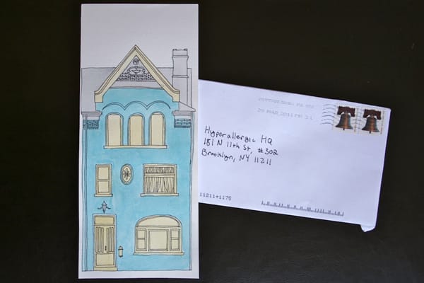 For his contribution to the Mail Art Bulletin, he created a great line drawing of a narrow house — I’m guessing early 20th C. — he spotted and added some beautiful watercolor color, which makes the image pop.