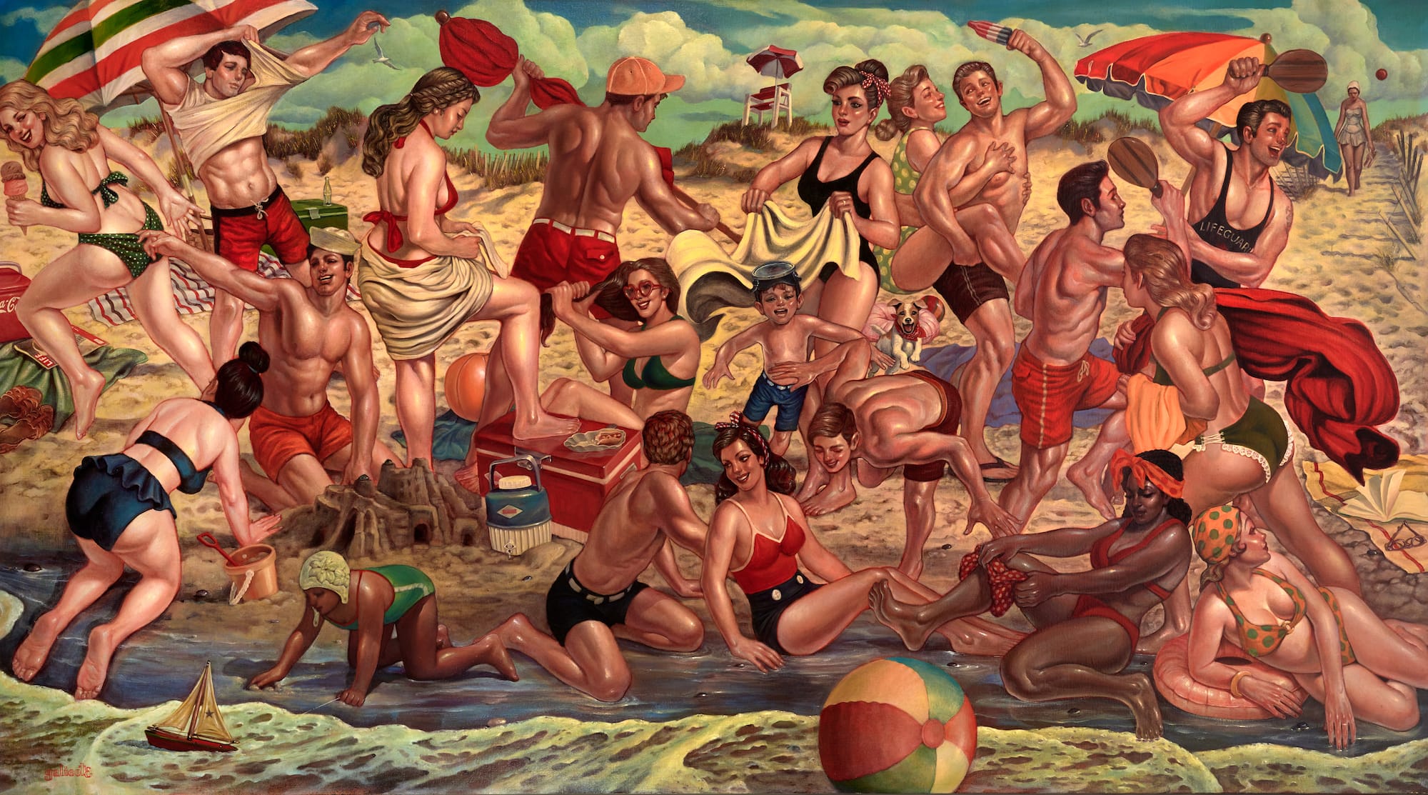 The Hilbert re-opened last month with nine exhibitions anchored by its permanent collection, a chronological presentation spanning the 1880s to the present. Examples of California Scene Painting by Fletcher Martin, Emil Kosa Jr., Millard Sheets, and other notable practitioners are updated with contemporary depictions of California life by Frank Romero, Sandow Birk, and Danny Galieote, whose masterful “Beach Bevy” (c. 2020) pays homage to Michelangelo’s unfinished "The Battle of Cascina."