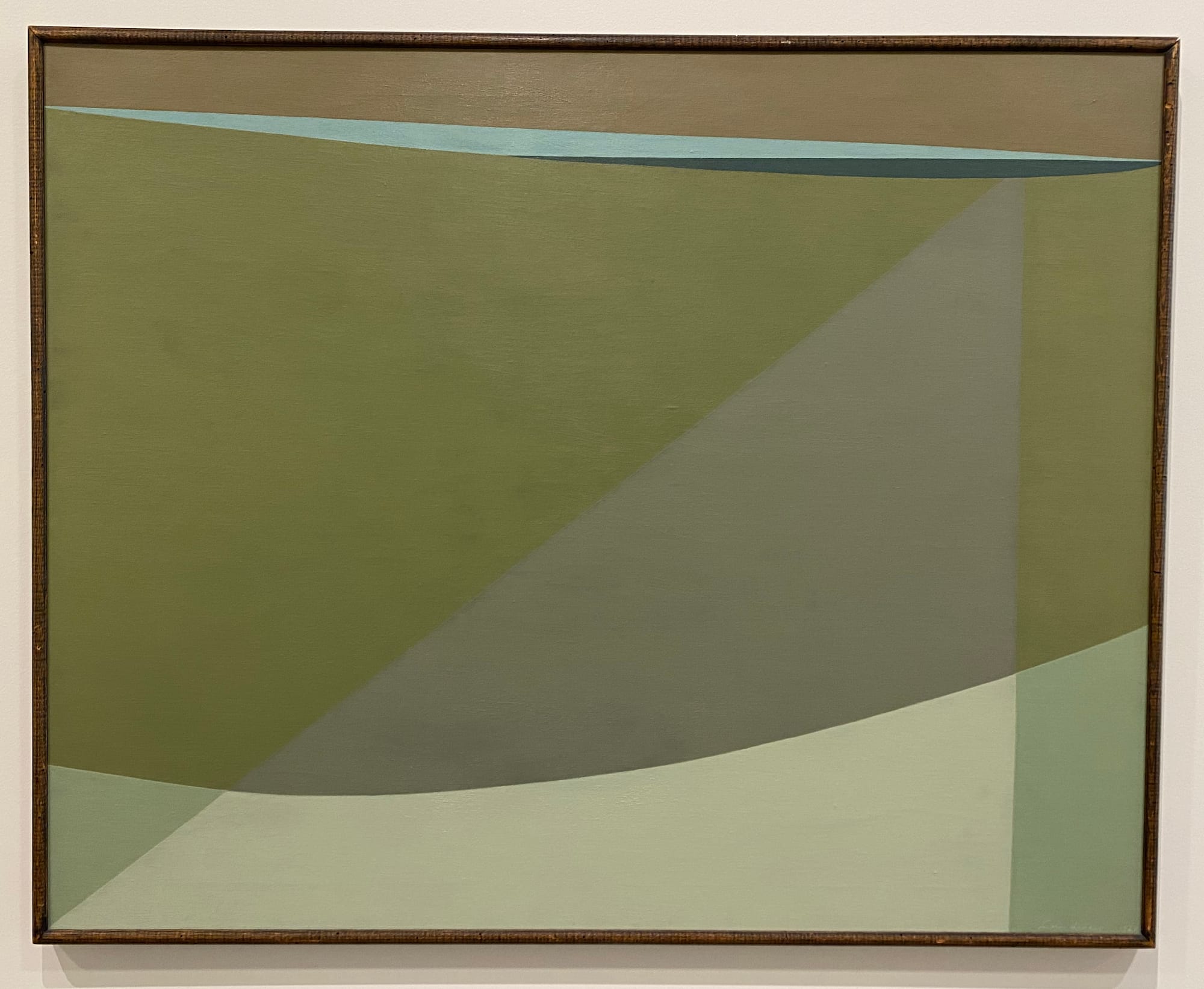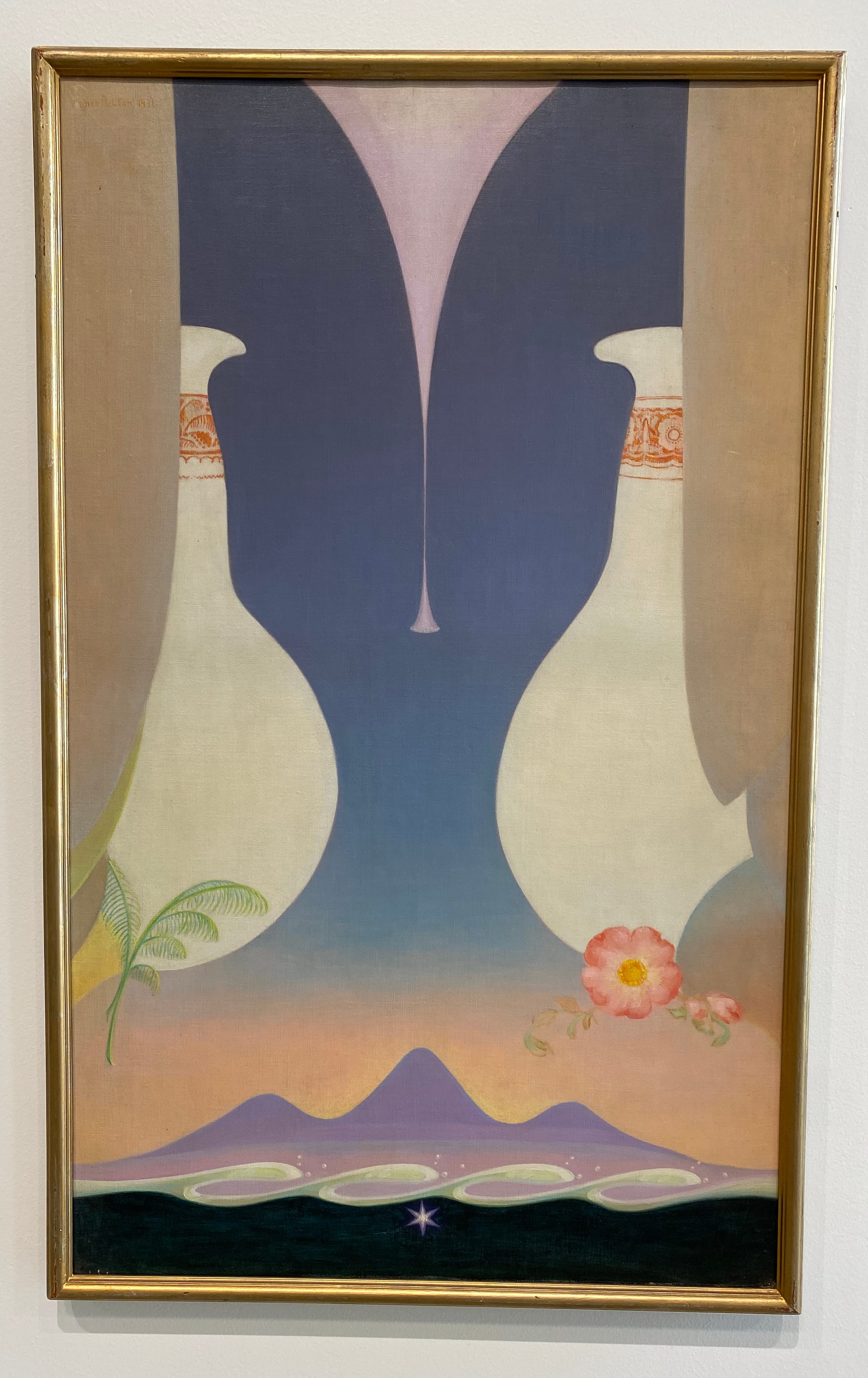The group show A Matter of Style: Modernism in California Art showcases a heterogeneous selection of mid-century artists working in a range of styles. Featuring visionary artist Agnes Pelton, hard-edge abstractionists Helen Lundberg and Karl Benjamin, and striking wood engravings by Paul Landacre, the exhibition portrays a multiplicity of California modernisms rather than a single strand. Among the highlights is a whimsical scene, "Untitled (Fantasy)" (1950s), by Kosa Jr., a well-known California Scene Painter and Hollywood studio artist who created the 20th-century Fox “searchlight” logo and a matte painting of the dilapidated Statue of Liberty for Planet of the Apes (1968). Platt surmises this might have been a concept sketch for the 1959 sci-fi film Journey to the Center of the Earth.