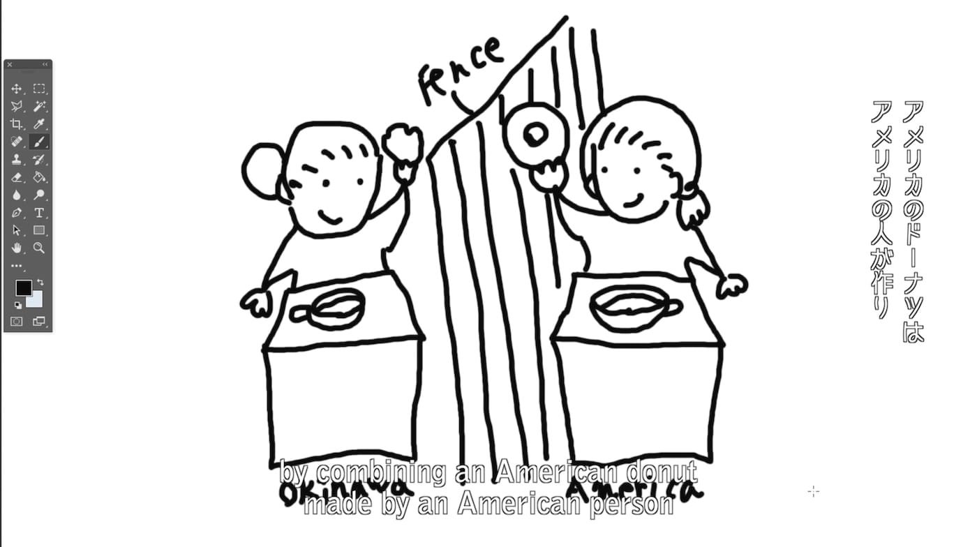 Making a Perfect Donut starts with a deceptively simple concept: the quest to combine an “American” donut with a sata andagi (an Okinawan deep-fried bun). To do so, Kyun-Chome (consisting of artists Eri Honma and Nabuchi) hatches a plan to position an American national inside a US base and an Okinawan on the outside and have them fry up their respective snacks on the spot and then merge them through a hole in a base fence.