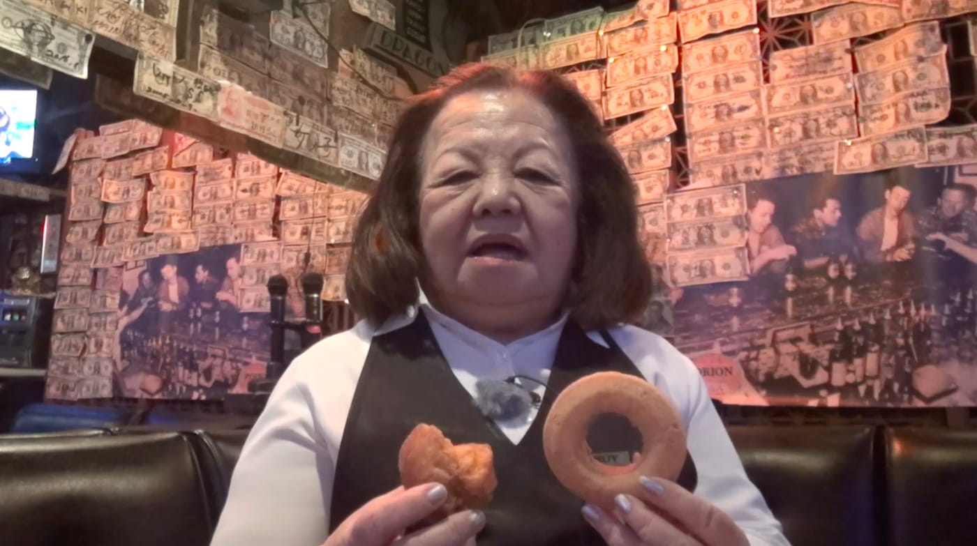 Herein lies the crux of the work: the reaction. These range from awe, to joy, to disgust (“I don’t want to fucking make a perfect donut with Americans”). Through this repetitive ritual, the donut and sata andagi are transfigured into a site for each interviewee to candidly, if indirectly, voice their opinion of US bases, which often becomes a deeply personal account of a formative experience or memory: One man recounts shooting fireworks at outgoing helicopters as a child at a time when relations between residents and the US military were less tense. A bar owner discusses watching American soldiers sticking dollars to the wall of her bar before going off to fight in Vietnam. The documentary carries the viewer again and again to a surreal moment where the meeting of two deep fried varieties of dough becomes an allegory for a fraught, often overlooked history.