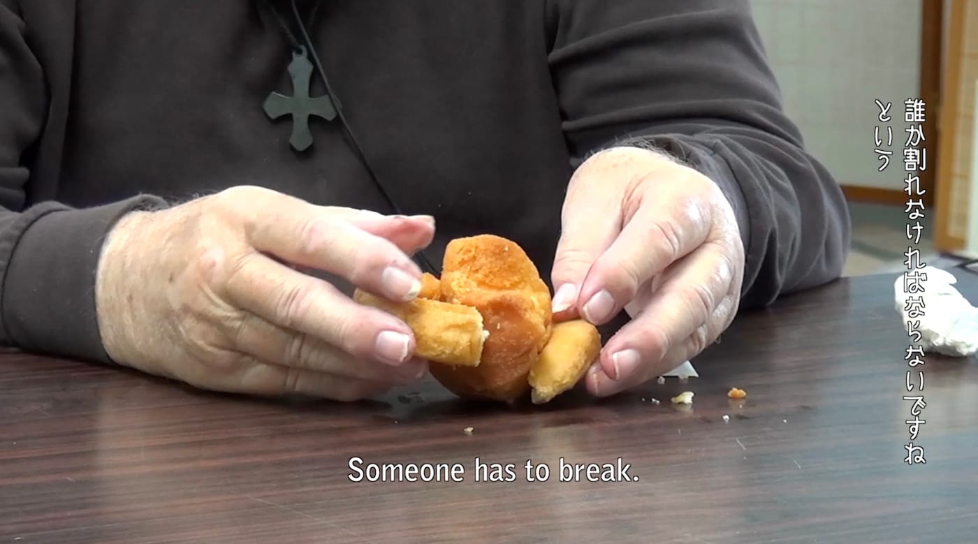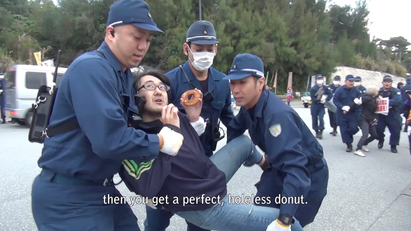 Making a Perfect Donut walks a tightrope between a nihilistic strain of the Dada tradition and overt political engagement. On one level, it seems to parody endless consensus-building exercises that ultimately only ever yield moral relativity and cynical detachment. The amateur zookeeper, for example, can’t directly voice his opposition to US bases because he makes a living off of them on construction contracts. A half-American manzai comic supports them for providing him a place to feel at home. On another level, the movie refuses to be critically distant from the issue: in one scene, Nabuchi is carried off by a group of police from a sit-in protest outside a base while reciting the “perfect donut” prompt. Resistance also occurs at the symbolic level: In a final interview, an American missionary who has resided in Okinawa for over 50 years holds the sata andagi and donut in weathered hands and proceeds to jam the two together. When the donut crumbles, the missionary smiles cryptically and says, “someone has to break.”