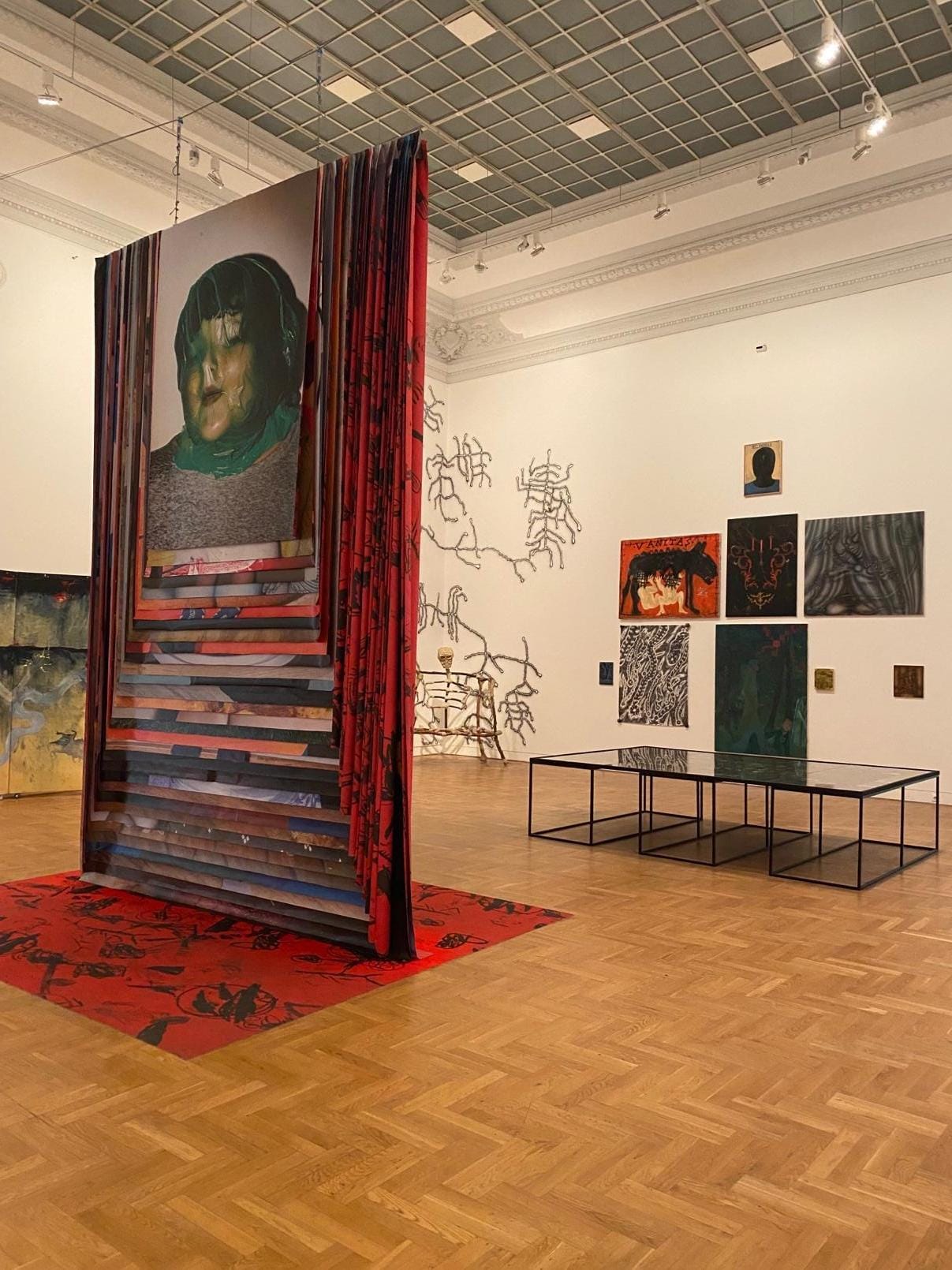 Installation view of The Discomfort of Evening at Zachęta National Gallery of Art, Warsaw; foreground: Karolina Wojtas, “Species: Brother. How to Annihilate” (2020)
