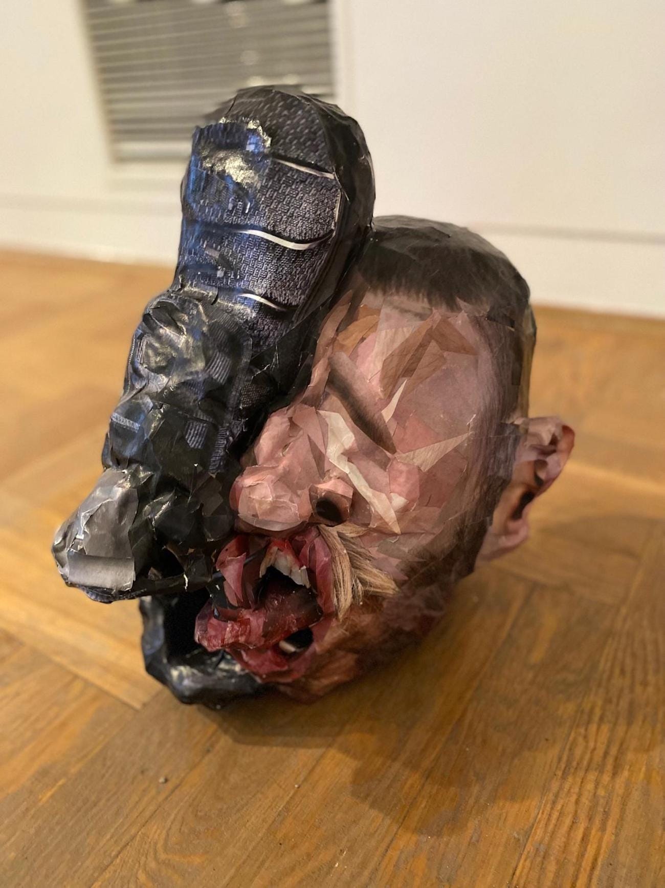 Sebastian Winkler’s sculptural work originated in a series on self-abuse while alluding to sexual fantasies of subordination within a queer context. Winkler takes photos of himself, which he then prints, tears, and collages onto the surface of a polyurethane foam core. In “David and Goliath,” a sneaker pressed into a face is both a fetish object and a threat, fusing desire, pain, and fear. Winkler’s work externalizes his anxieties through his sculptural collages while acknowledging his vulnerable position as a queer person in conservative Poland.