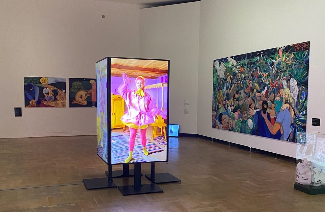 Installation view of The Discomfort of Evening at Zachęta National Gallery of Art, Warsaw; center: Kacper Szalecki, “Game of Telephone” (2022), video