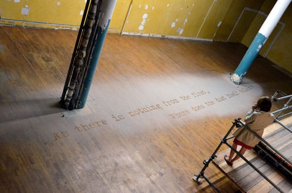 The dust was blown around by a leaf blower before it was allowed to settle on the floor. Stenciled into that powder is a quotation from a Zen poem that reads:
