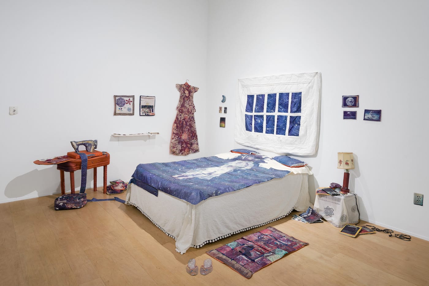 A small room devoted to Catherine Jansen’s “Sewing Space” (1981), puts the female subject at the center of a meditation on traditionally female labor, such as sewing, and women’s involvement in scientific enterprises, such as space travel. Jansen’s xerographic installation consists of a queen-sized bed, with the image of a sleeping woman in the middle, a sewing machine in the corner, and copies of magazines devoted to space travel stacked on a night table. Every item except the bed is a sewn replica — including the sewing machine, which is sewing a length of fabric that runs directly to the bedspread. The room is a soft space that conjures celestial dreams, as it pointedly challenges the false dichotomy of male and female labor.