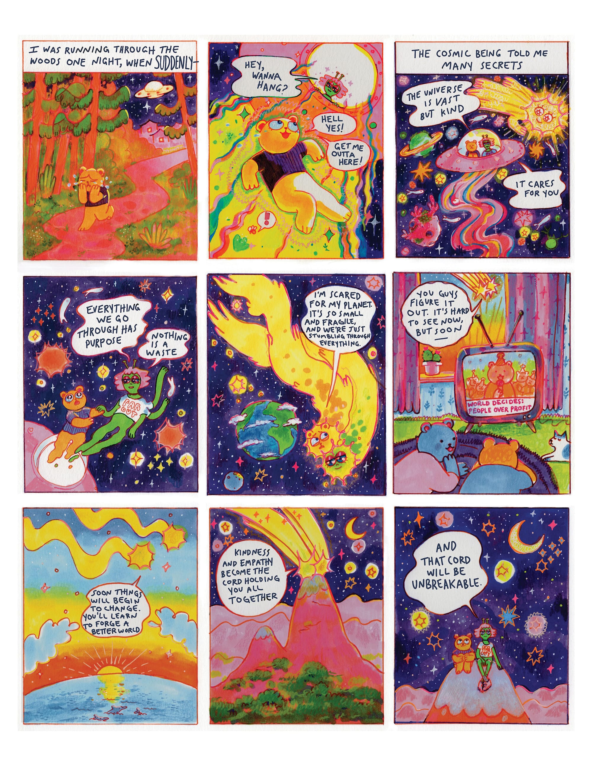 As a book, and a visually distinctive one at that, Rescue Party feels like both a celebration and a memorial: We made it. The “we” here is both self-selecting — Fowler and Desert Island are part of a tightly-knit, if wide-ranging creative community — and somewhat universal, as the resulting works are wildly expansive in nature, formally and culturally. Individually, the comics are delightfully dreamy testaments to that scary, suspenseful moment in time — and to hope itself. Its message, as a result, is timeless — more relevant than ever.
