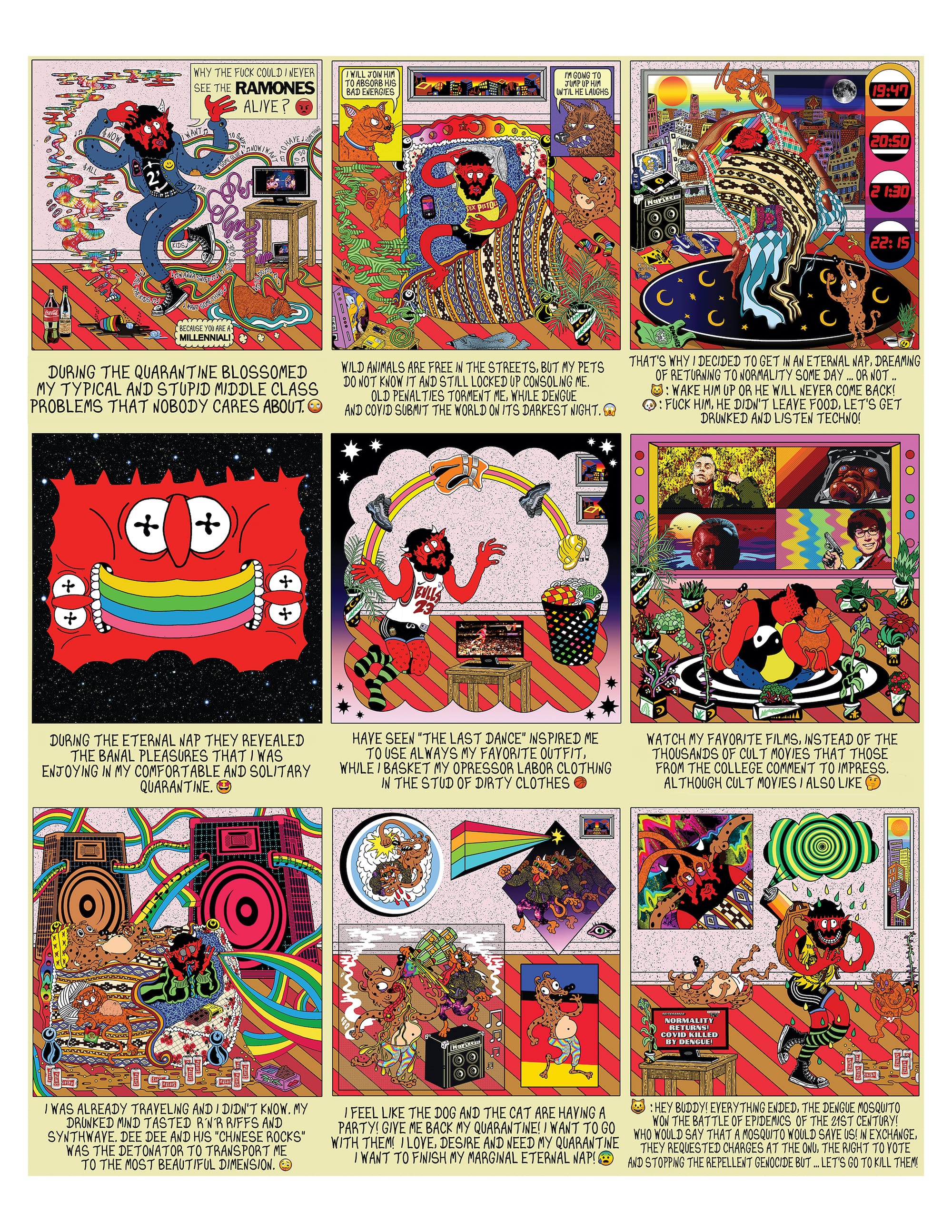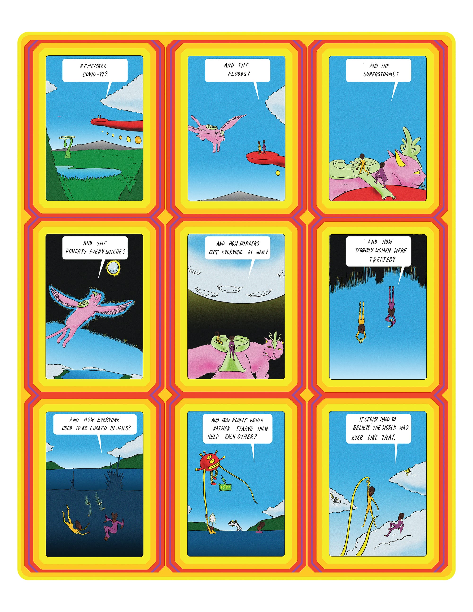 Fowler imposed just a few constraints on his would-be contributors: Submissions mustn’t exceed a standard 9-panel format, and the outlook should be if not positive, then forward-looking at least. Rescue Party is about a shared imagination of what a future beyond COVID-19 might hold.