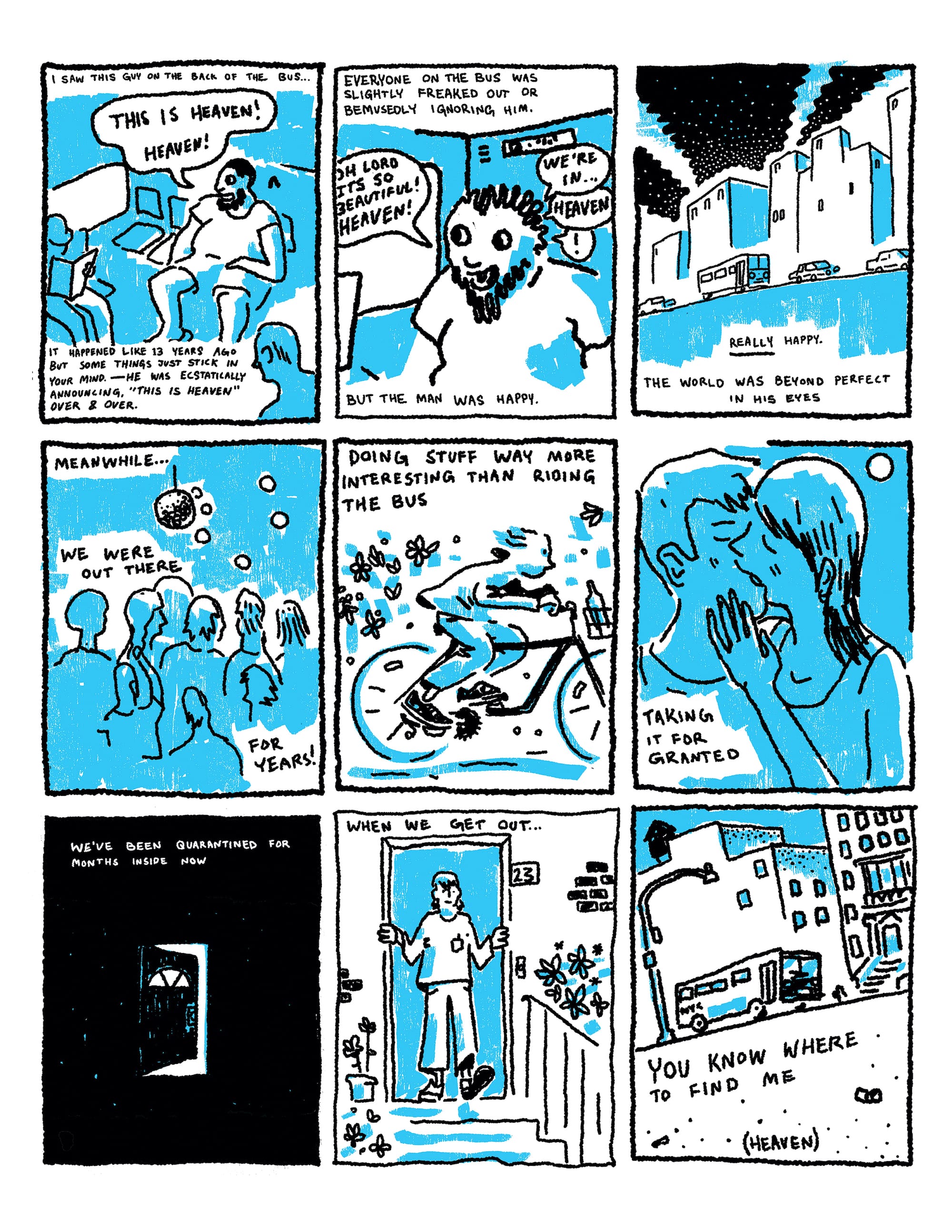Ultimately, Rescue Party conjures a series of questions, some perennial, about and around form. These provocations remain as existential in nature as the pandemic itself: Why does the grid — as well as the physical book — persist as the preferred format for comic artists? What new, novel possibilities does the present-day Internet, in all of its horrors, hold for comic creators in 2024? What gets lost in translation, experientially speaking, when digital is translated into print — and vice versa? Did Rescue Party really need to be transformed into a book at all? The party, it seems, isn’t over yet.