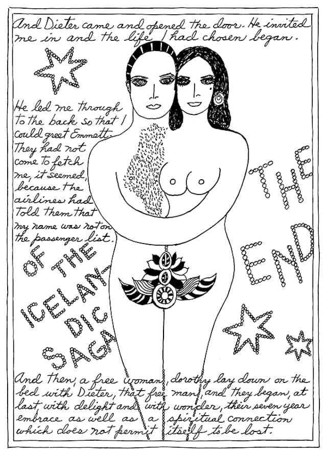 It’s fitting that An Icelandic Saga opens Siglio Press’s new collection of Dorothy Iannone’s image-and-text artworks. Writing the Saga retrospectively — in 1978, 1983, and 1986 — Iannone describes her trip to Reykjavík in 1967 as the “journey which seems to have made all other journeys possible.” It was there she met the artist Dieter Roth, with whom she swiftly fell in love and for whom she left her husband and a comfortable life in the United States. But it also marks the start of another kind of journey: Iannone’s maturation as an artist and her lifelong quest to achieve ecstatic unity, or “becoming one with another” by way of erotic love.
