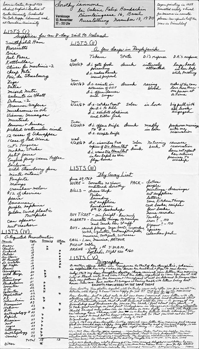 Dorothy Iannone describes her trip to Reykjavík in 1967 as the “journey which seems to have made all other journeys possible.” It was there she met the artist Dieter Roth, with whom she swiftly fell in love and for whom she left her husband and a comfortable life in the United States.