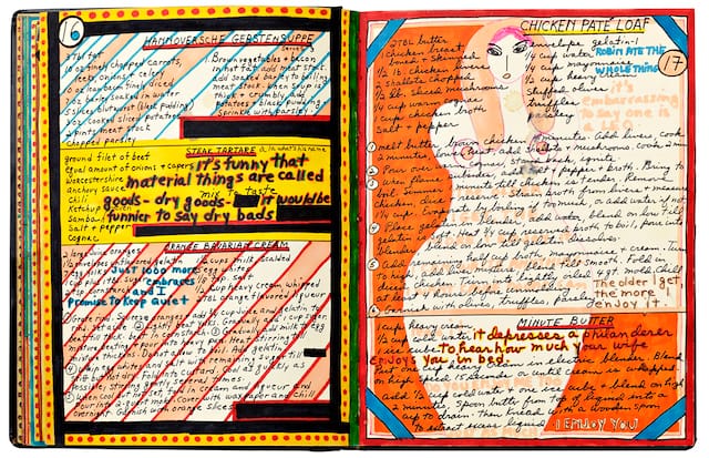 Another, and very different, example of this impulse is Iannone’s Cookbook (1969), a 69-page book that is excerpted here in 26 pages. Iannone used felt pens to write densely packed text and to decorate the pages, which are flush with color and framed by patterned designs. Interspersed among the lists of ingredients and instructions are bits of introspection: sentences or fragments that are written in the fat script of a colored marker or in the thinner line of a black pen and then traced over or highlighted with a colored one.