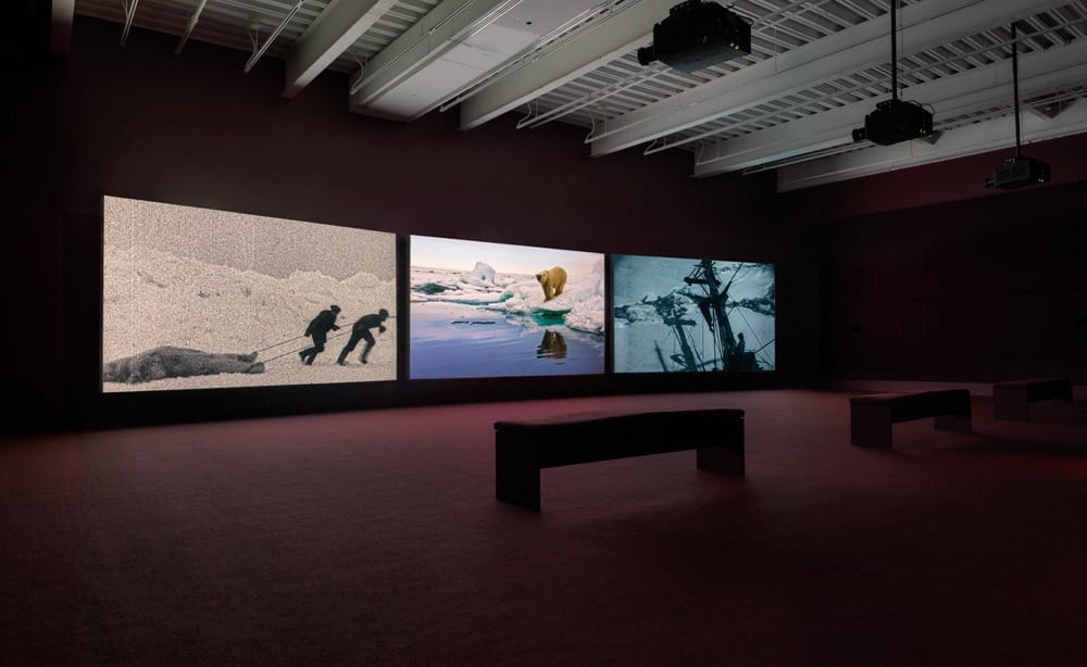There are other films on display in the New Museum’s John Akomfrah: Signs of Empire exhibition, and perhaps “The Unfinished Conversation” about the life and significance of the intellectual powerhouse Stuart Hall is just as compelling as “Vertigo Sea” in its own way. But this three-channel film, originally made for the 2015 Venice Biennale, is overwhelmingly lush. There’s too much, really: too much sea, with its miles of fish and plankton roiling the deeps; too much predacious elegance, watching cormorants plunging into the sea like a hail of knives, to pierce the bodies of those fish and feed. There is too much gratuitous death, as in the images of hunters taking down polar bears, which once powerful and stately after the crack of a hunter’s rifle are made into an inert mound of fur and flaccid carcass which is then dragged across the ice as some scavenger’s plunder. There are too many vignettes of humankind’s rapacious exploitation of resources for reasons beyond bodily need. I see images of slaves belched up on beaches from the hulls of foundered ships, a trussed-up deer waiting to be eaten and I know what connects them is that both have been rendered into plunder in the formation of empires.