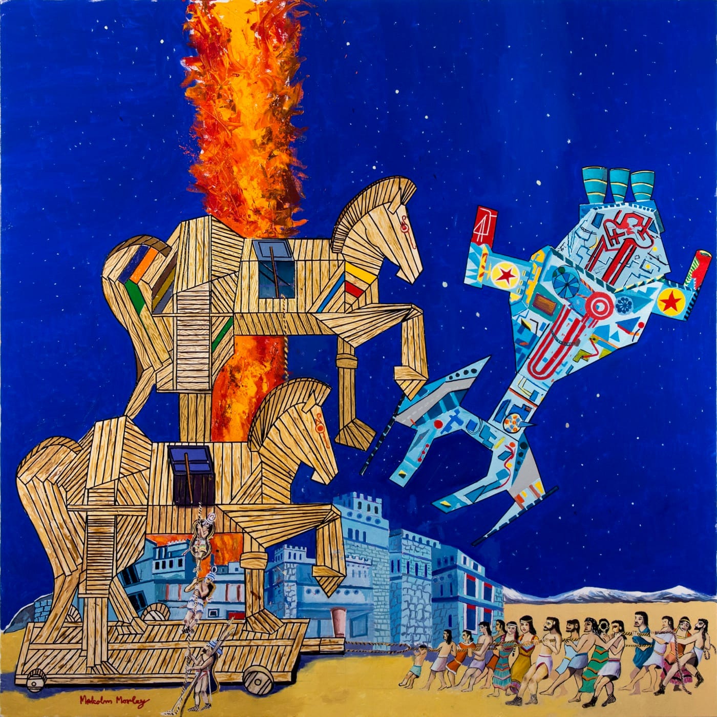 Morley leans on the idiom of surrealism throughout the show. The piece “Piazza d’Italia with French Knights” (2017) looks like he plopped the knights down in a setting painted by Giorgio de Chirico. But Morley didn’t stick to that script. In paintings like “Hobby Horse” (2015), which is my favorite of the exhibition, he has not one Trojan Horse, but two, one on top of the other, plus a biblical pillar of fire and a cartoonishly mangled three-stage rocket falling out of the spangled sky — because why the hell not? It’s like story time with a young child who hasn’t learned yet to pay attention to narrative continuity and historical verisimilitude. I walk through the exhibition thinking that Morley, who died just earlier this year, must have had great fun making these paintings.