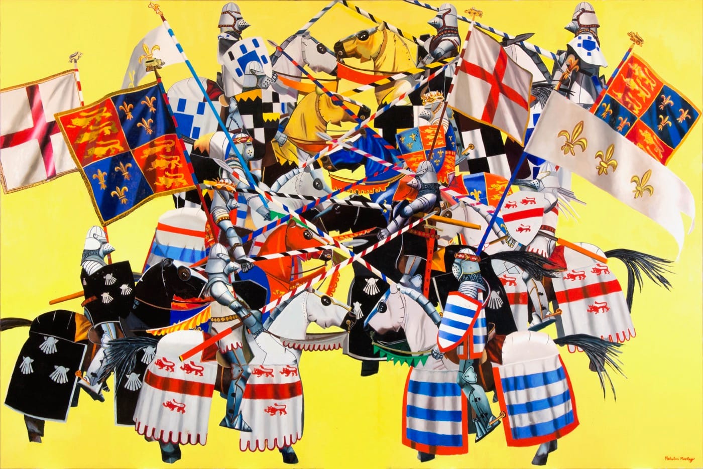 Malcolm Morley, “French and English Knights Engaged in Mortal Combat” (2017), oil on linen, 50 x 50 inches