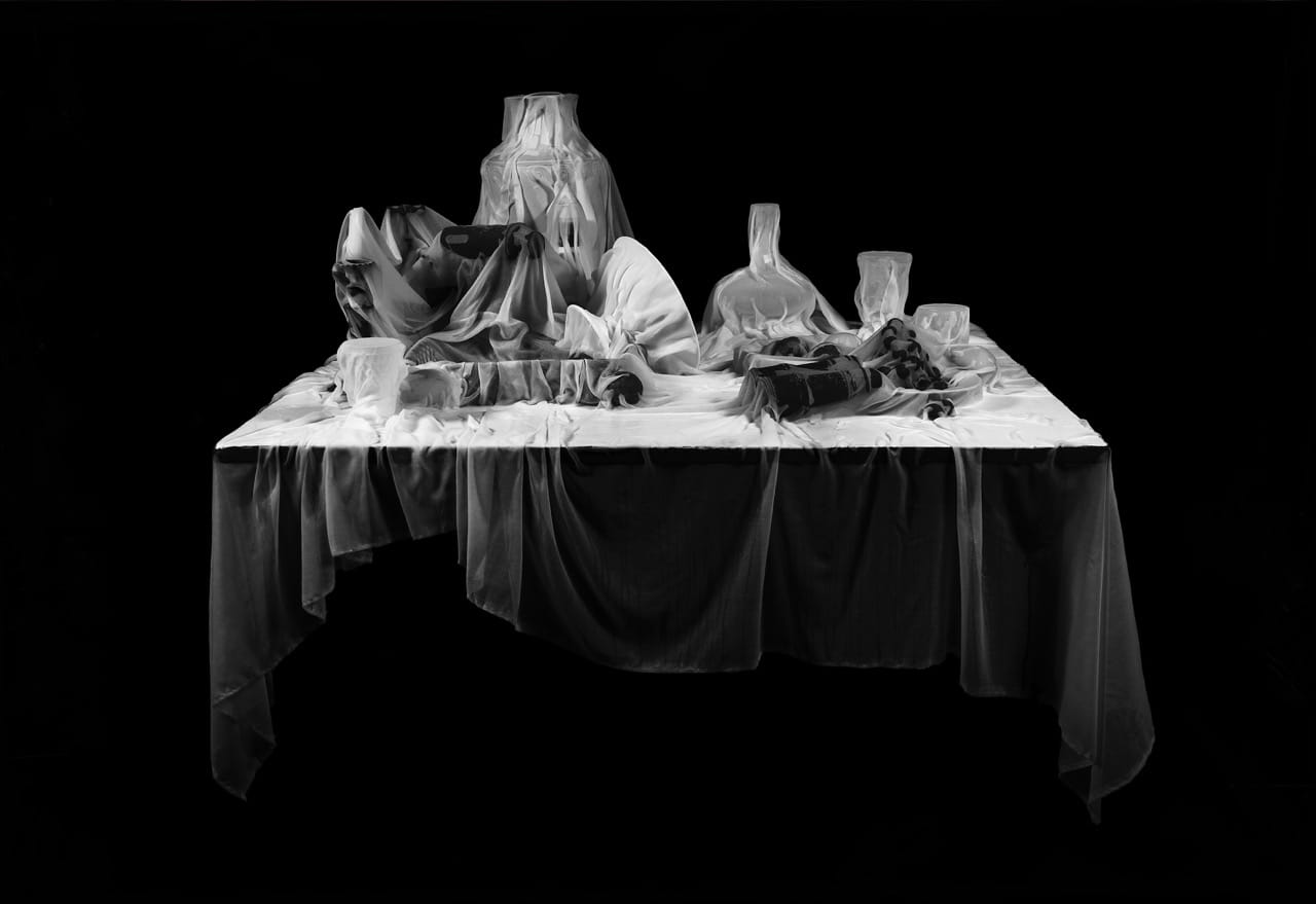 I see the chandelier’s long centerpiece, a glass teardrop hanging the middle of room, swinging. Then it stops mid-motion. The room keeps turning. Shots of people passing through go distorted as if the images are melting through a fish-eye lens. A child appears and then is asleep in the chair in the corner, and then seems to flit at super speed through the room like a hummingbird. I now can’t be sure how much of the room is real and how much was created by the artist. “Pendulum” may — at its heart — be about giving the room a kind of consciousness along the valences of Freudian mechanics: the room is anxious, not sure where to stay and settle, so it keeps looking, panning, twirling, and wondering how it will ever belong.