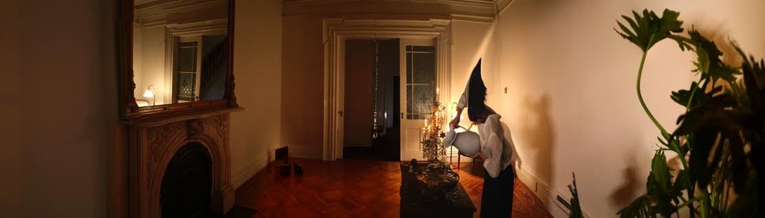 Kosemura has created a video work projected onto two mirrors in the main salon — one broader than it is tall situated over the fireplace, and the other long and placed at on an adjacent wall. They display the images shot in the same room, which is where Kosemura spent the summer. She uses a simple motion of her camera panning from right to left and back, left to right, but sometimes the images are blurry, then they become strong and vibrant. A vibrantly green plant blurs, then is seen reflected in a mirror, then in full verdant regalia as the room becomes bathed in natural light. But the light fades, and the camera shifts again to glimpse the world outside the windows, sped up suddenly, so that day becomes evening in seconds and the shadows come in like a changing of the guard. Then I see, vaguely through the frosted glass of the doors, someone cleaning them. Someone also waters the plants, but they’re not recognizable. Then the camera pans to take in the table arranged like an old European still life with its candelabra and shifting shadows. The repetitive motion is calming, but then the scenes keep shifting.