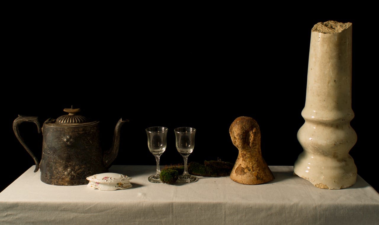 The artist had shown with Dillon back in 2008, and Dillon wanted to work with her again. Kosemura had an artist’s residency at Residency Unlimited, (which is where I first encountered her work) but found herself needing more space than the small studio she was allotted there. To make “Pendulum,” Kosemura gave herself two rules: first to make the content of her video and the installation be of the same place. The second rule was to introduce movement, but one that is simple and rhythmic, such as a pendulum. In the installation, you can see these rules being followed. The effect of watching the video is surreal. I stand in a space and watch an edited, slightly anxious video shows the same space of the salon, an early 20th century sitting room with its Parquet wood floors, its intricately carved marble fireplace, the two outside windows made to block out natural light with inserted panels, the French doors inlaid with patterned glass, and the chandelier with its one hanging lobe in the center of the room like one of the last souvenirs of the Hapsburg empire. There is also a table with an antique candelabra, a broken hand mirror, the vertebra of an animal, a collection of small brass bells, and a lace table cloth.