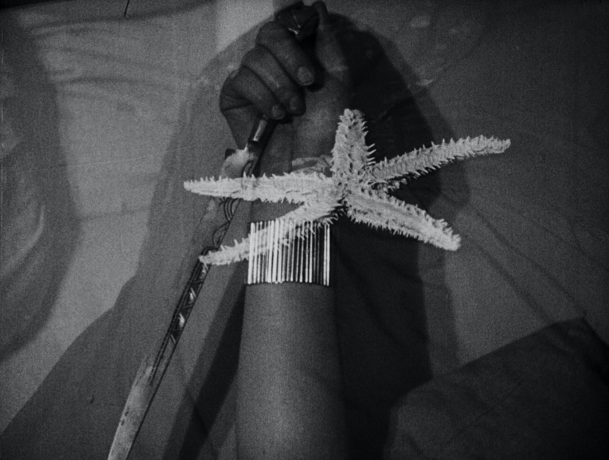 Three of the four films feature Jazz Age icon Kiki de Montparnasse, who clearly enjoys waggishly toying with the camera’s gaze, subverting Ray’s frequent fetishization of her body parts. “Women’s teeth are objects so charming,” reads an excerpt of “L’etoile de mer” (“The Starfish”) by Surrealist poet Robert Desnos, one of many lines that appear during the film of the same name, giving off a more droll than earnest tone.